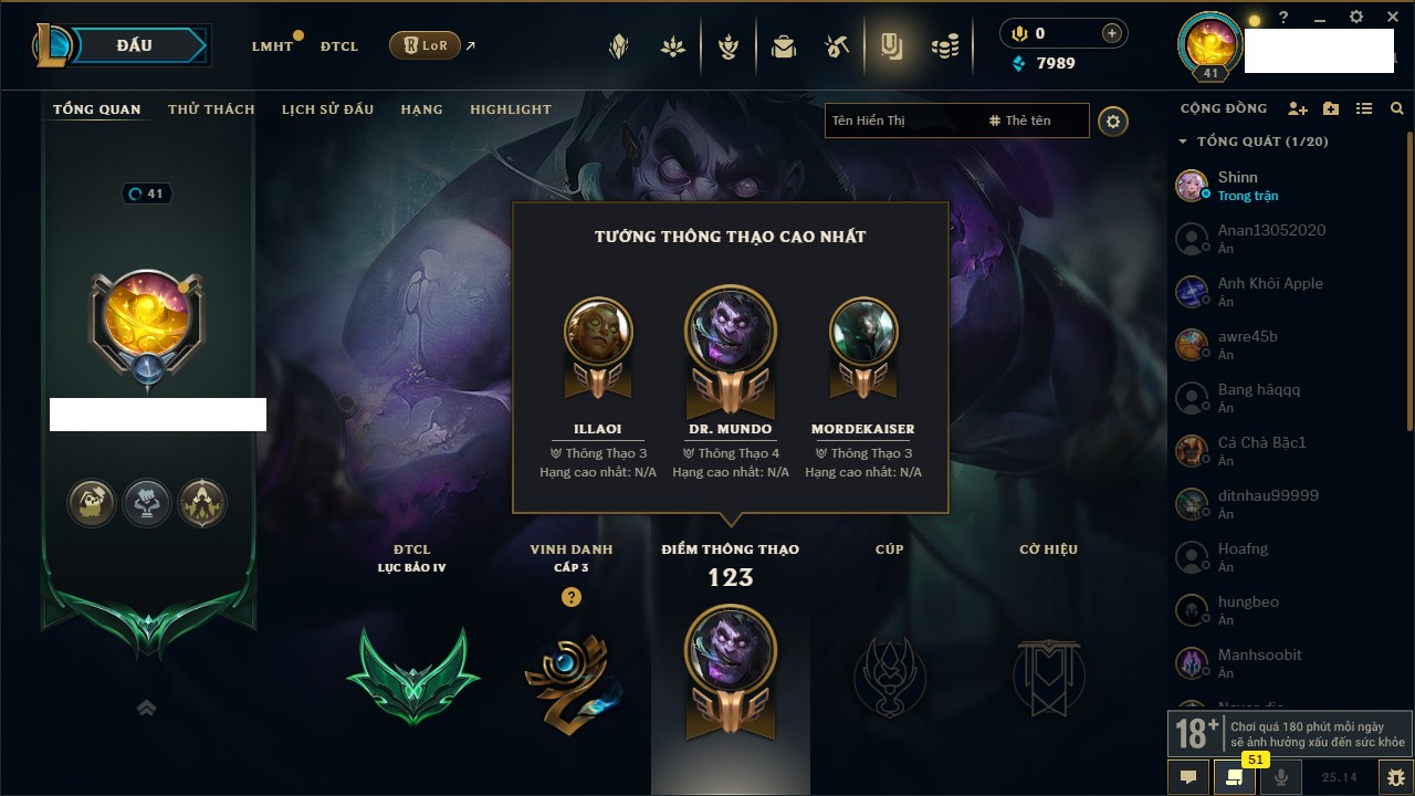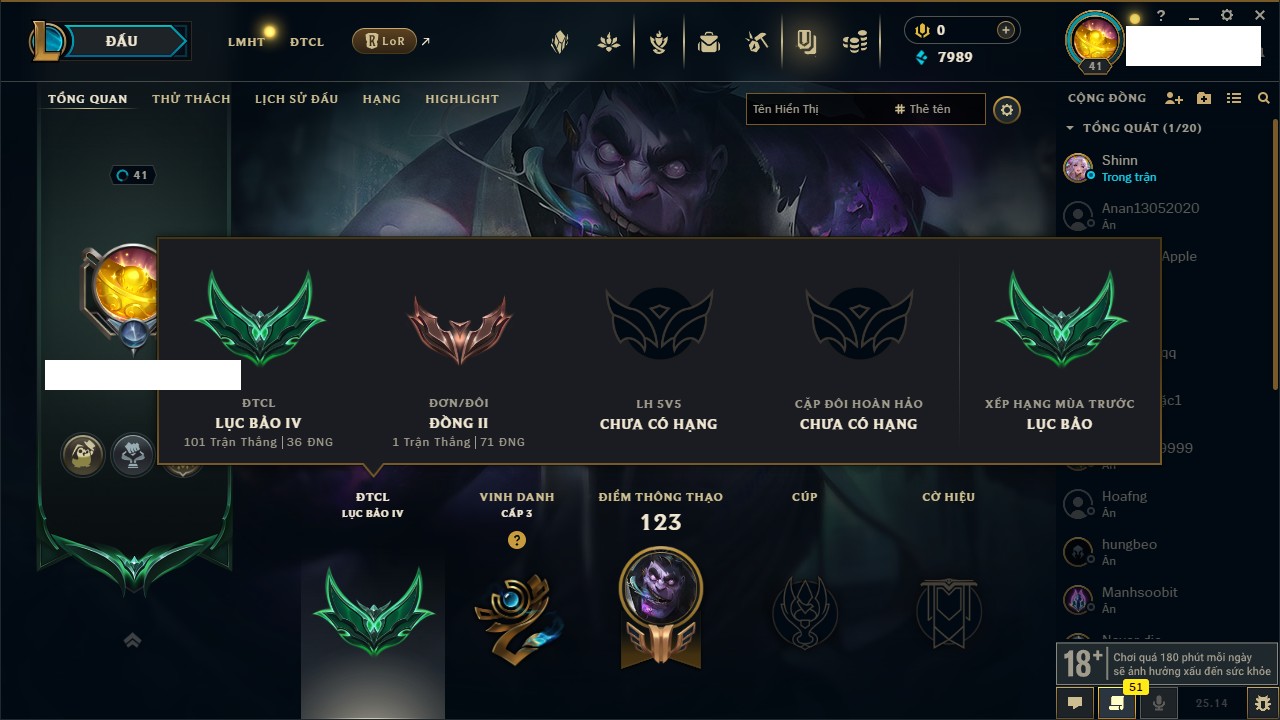 Rank Đơn: Bạch Kim IVKhung: Bạch kimTướng: 171 - Còn 154285 THXTrang Phục: 169Rank ĐTCL: Bạch Kim IILinh Thú: 60