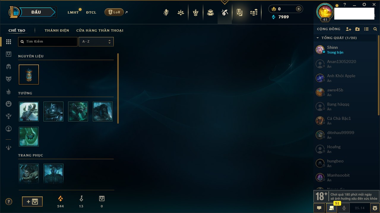 Rank Đơn: Vàng IVKhung: BạcTướng: 166 - Còn 180925 THXTrang Phục: 163Rank ĐTCL: Chưa RankLinh Thú: 67