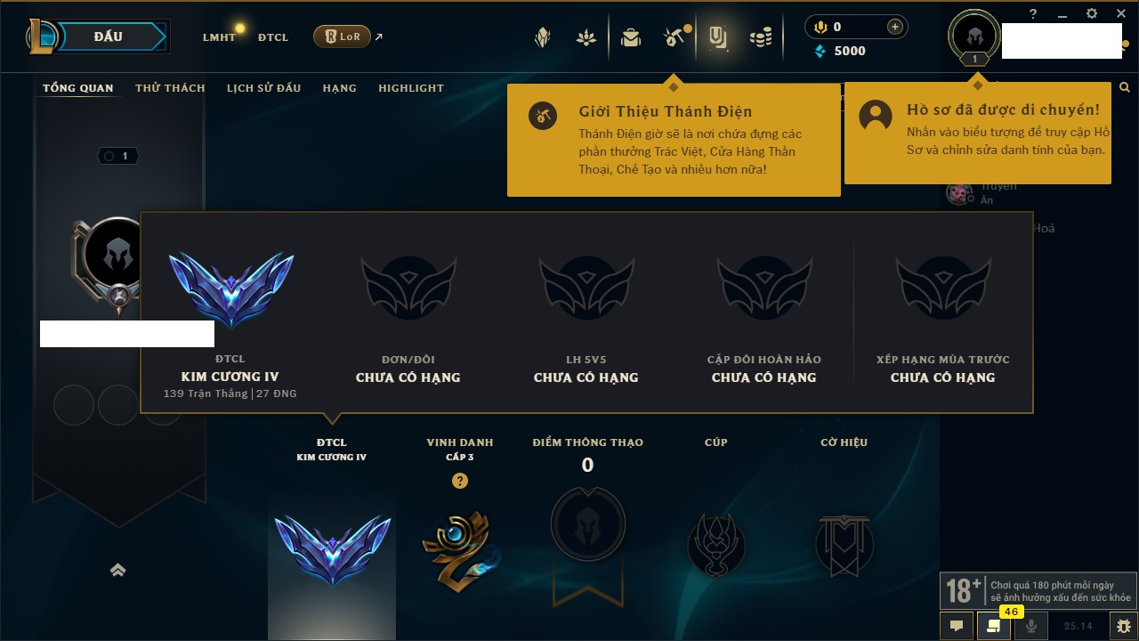 Rank Đơn: Chưa rank mùa nàoKhung: Chưa có khungTướng: 4 - Còn 12000 THXTrang Phục: 0Rank ĐTCL: Bạch Kim IIILinh Thú: 20