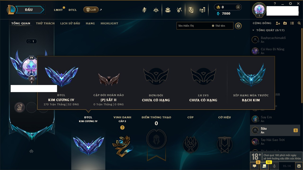 Rank Đơn: Vàng IKhung: BạcTướng: 171 - Còn 60584 THXTrang Phục: 286Rank ĐTCL: Vàng IIILinh Thú: 117