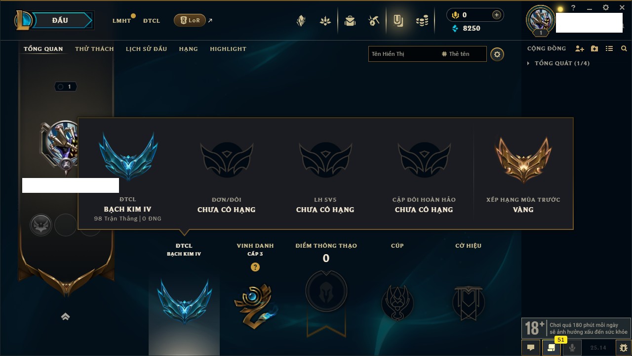 Rank Đơn: Bạch Kim IIKhung: Bạch kimTướng: 171 - Còn 263986 THXTrang Phục: 306Rank ĐTCL: Lục Bảo IVLinh Thú: 96