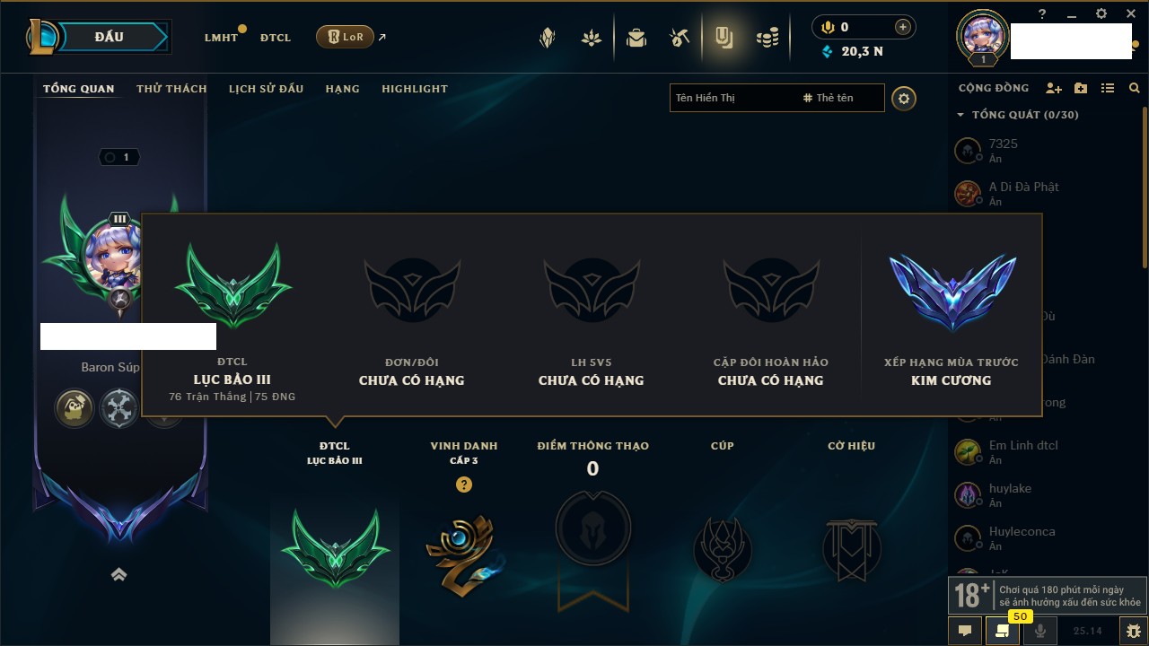 Rank Đơn: Lục Bảo IVKhung: VàngTướng: 171 - Còn 154648 THXTrang Phục: 203Rank ĐTCL: Bạch Kim IVLinh Thú: 69