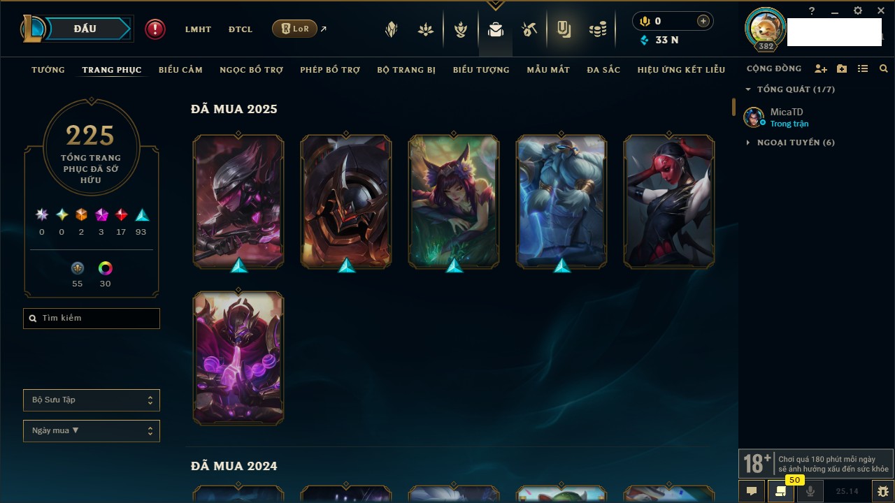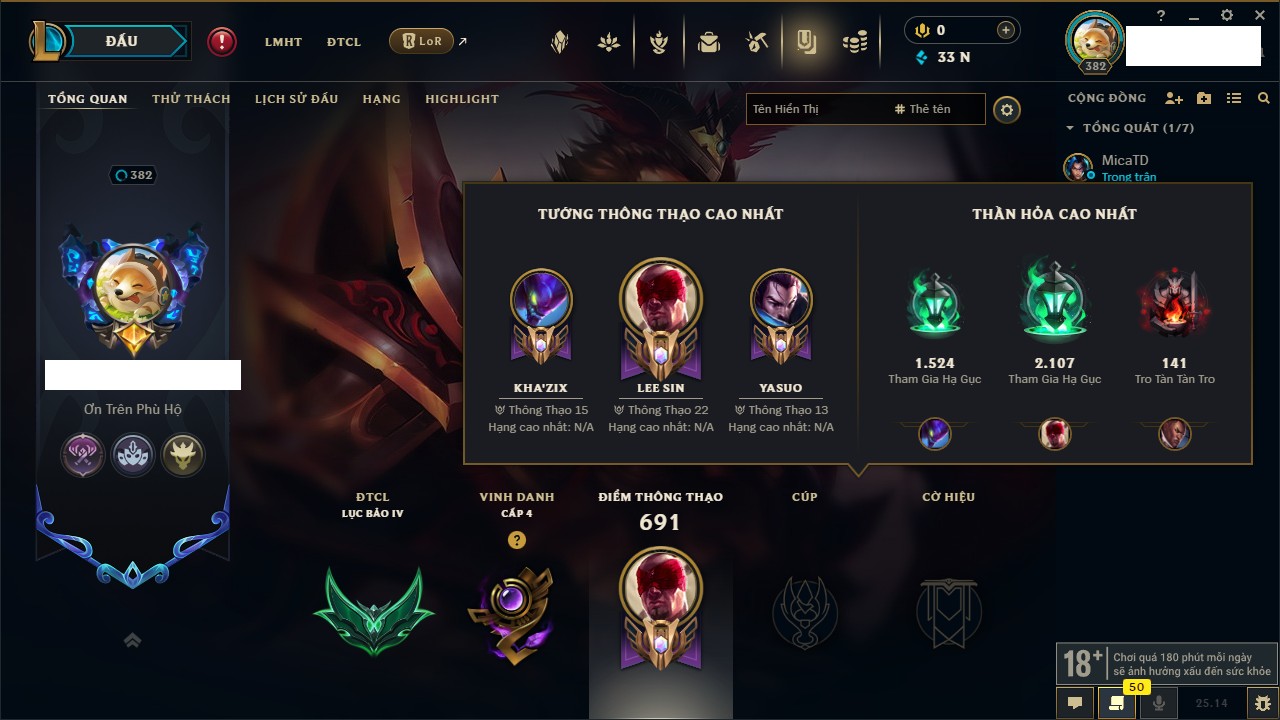 Rank Đơn: Đồng IIKhung: ĐồngTướng: 170 - Còn 66145 THXTrang Phục: 215Rank ĐTCL: Chưa RankLinh Thú: 52
