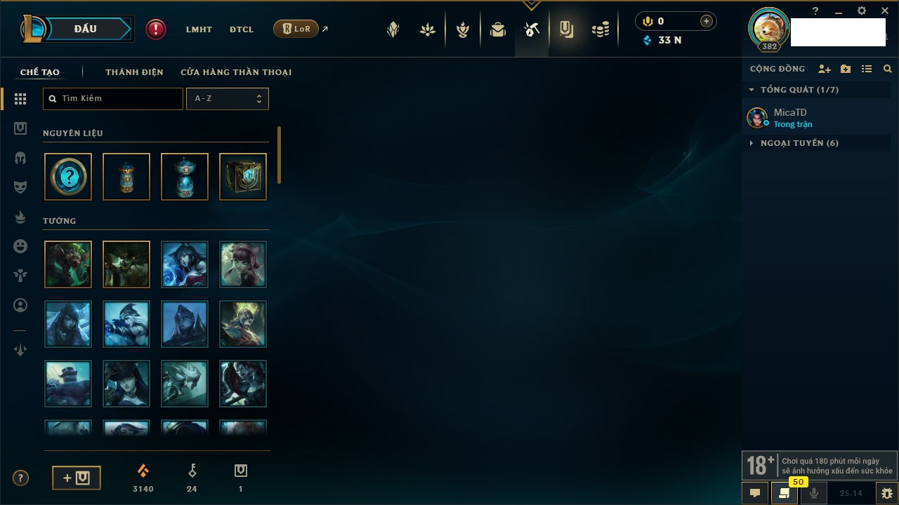 Rank Đơn: Vàng IIIKhung: BạcTướng: 171 - Còn 101359 THXTrang Phục: 88Rank ĐTCL: Kim Cương IVLinh Thú: 200