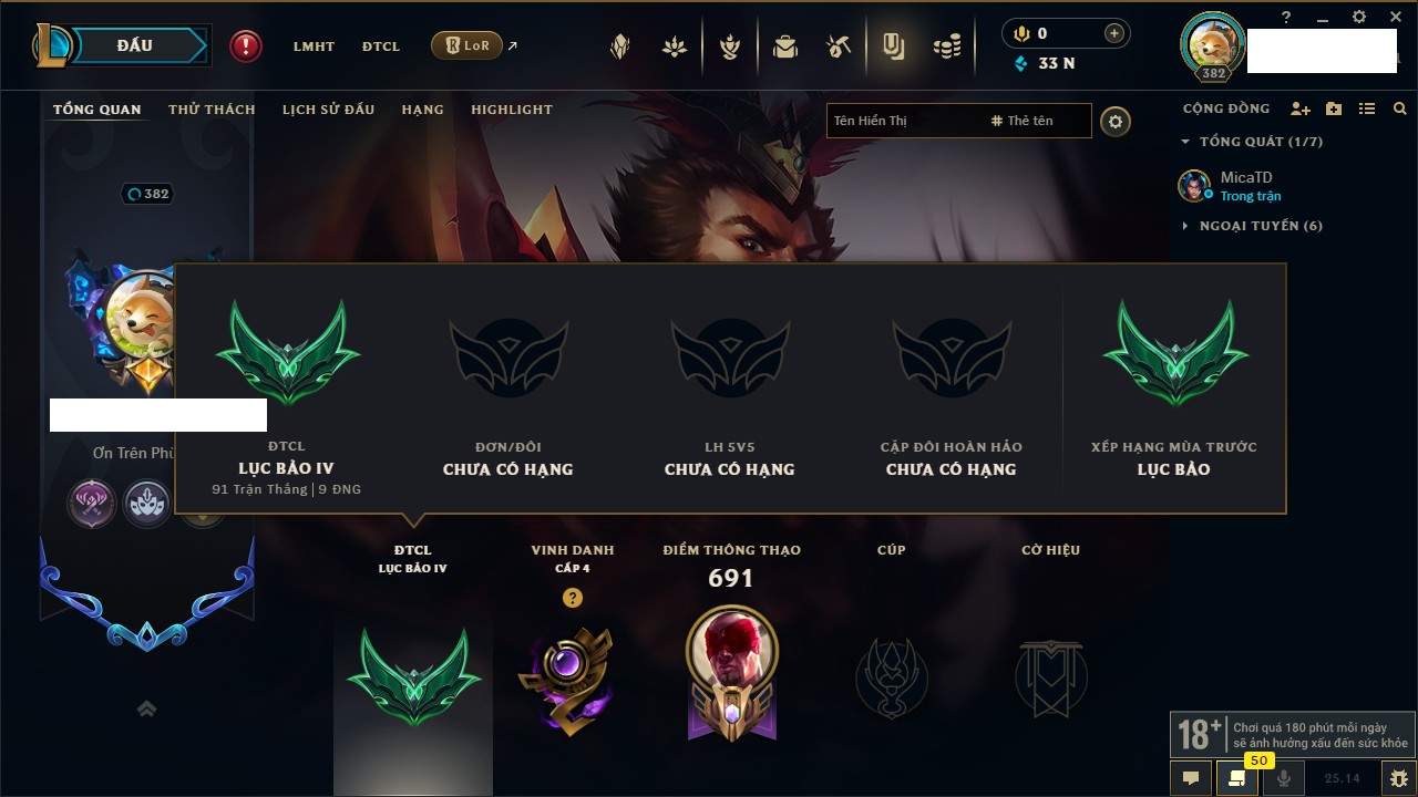 Rank Đơn: Lục Bảo IVKhung: Bạch kimTướng: 171 - Còn 128452 THXTrang Phục: 193Rank ĐTCL: Bạc IIILinh Thú: 100