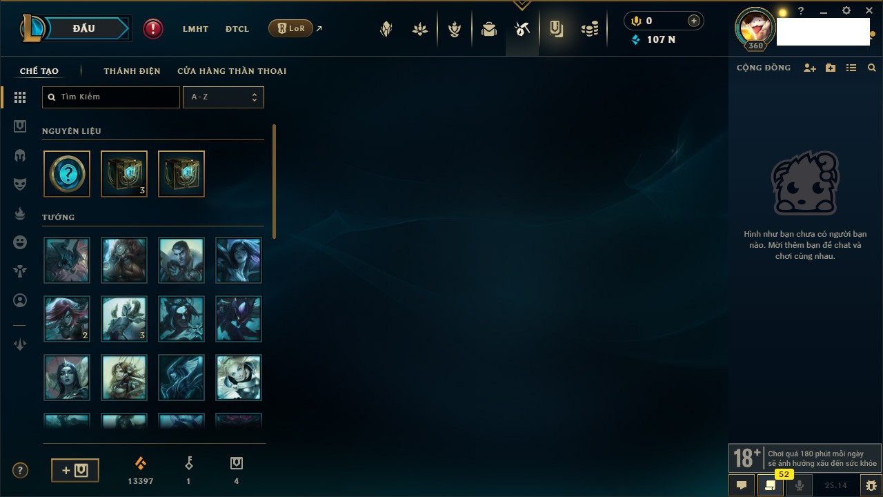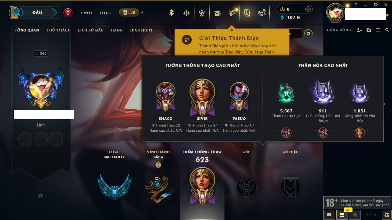 Rank Đơn: Bạch Kim IVKhung: VàngTướng: 171 - Còn 130578 THXTrang Phục: 253Rank ĐTCL: Chưa RankLinh Thú: 20