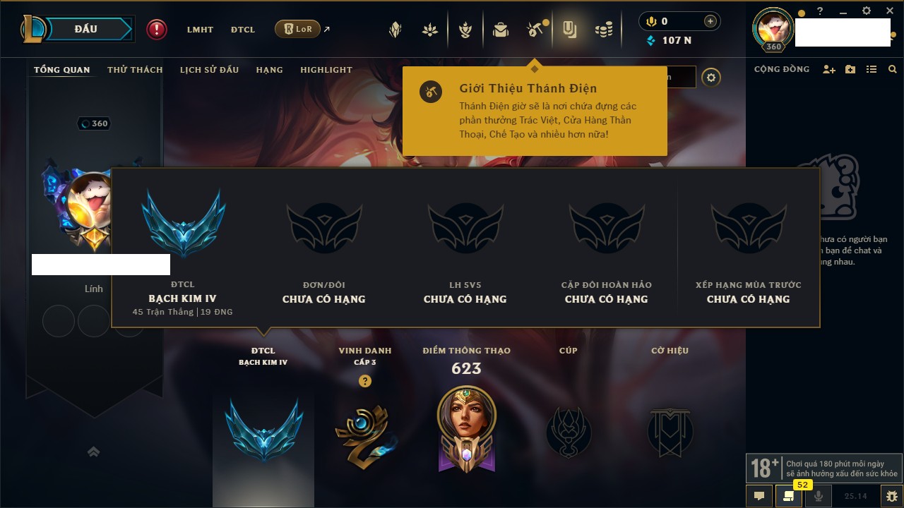 Rank Đơn: Bạch Kim IVKhung: VàngTướng: 171 - Còn 130280 THXTrang Phục: 226Rank ĐTCL: Kim Cương IVLinh Thú: 183
