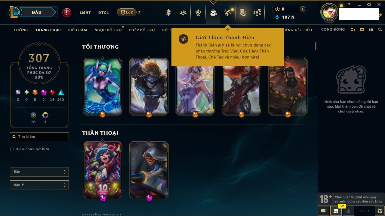 Rank Đơn: Vàng IIKhung: VàngTướng: 171 - Còn 219803 THXTrang Phục: 254Rank ĐTCL: Chưa RankLinh Thú: 78