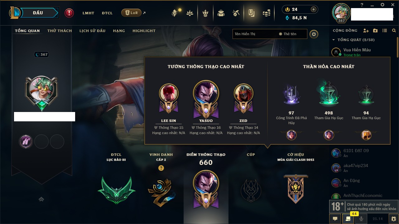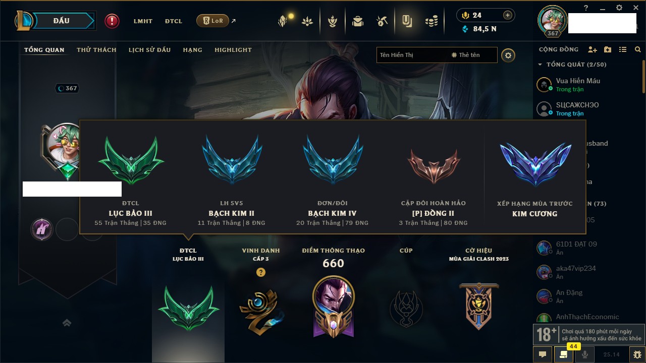 Rank Đơn: Lục Bảo IVKhung: Bạch kimTướng: 171 - Còn 128452 THXTrang Phục: 193Rank ĐTCL: Bạc IIILinh Thú: 100