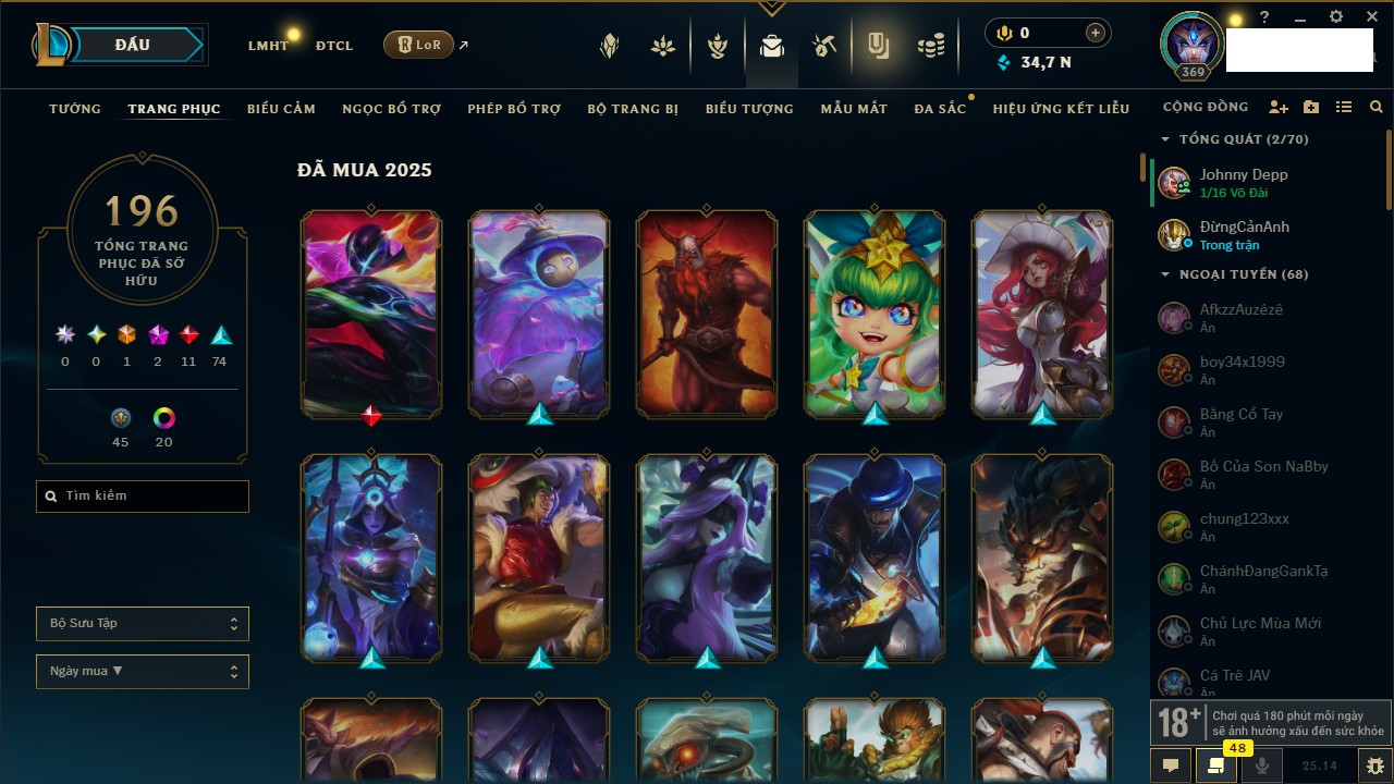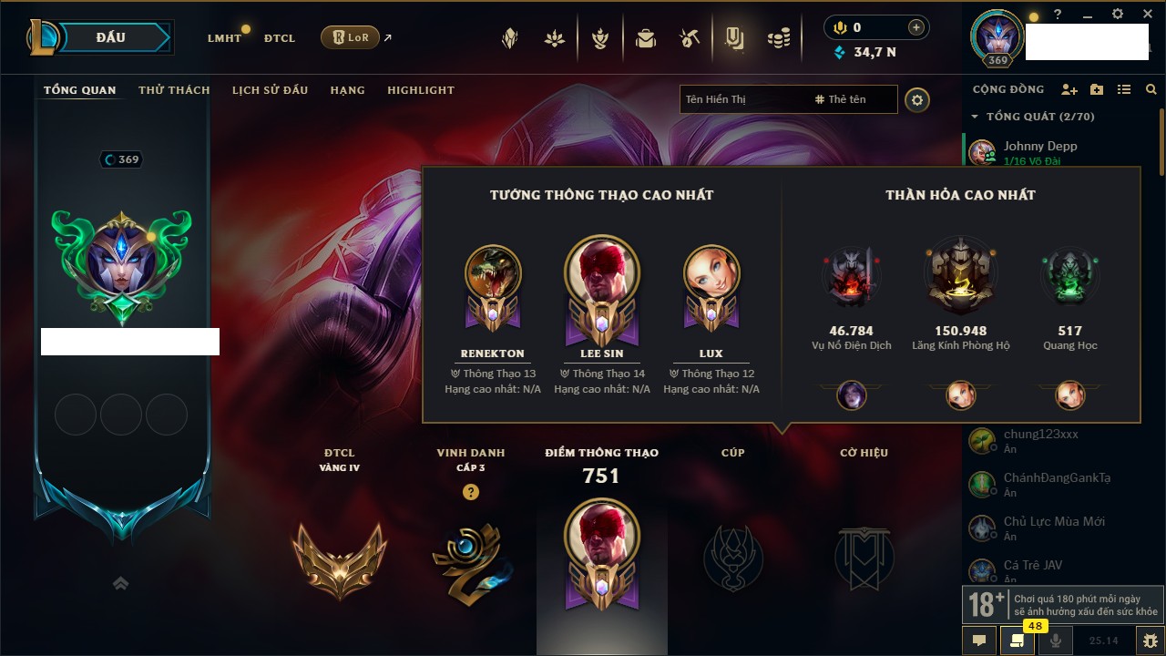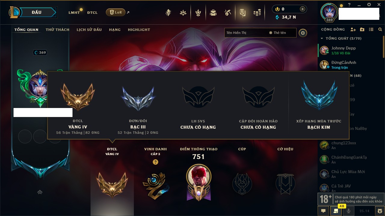 Rank Đơn: Vàng IIIKhung: BạcTướng: 171 - Còn 101359 THXTrang Phục: 88Rank ĐTCL: Kim Cương IVLinh Thú: 200
