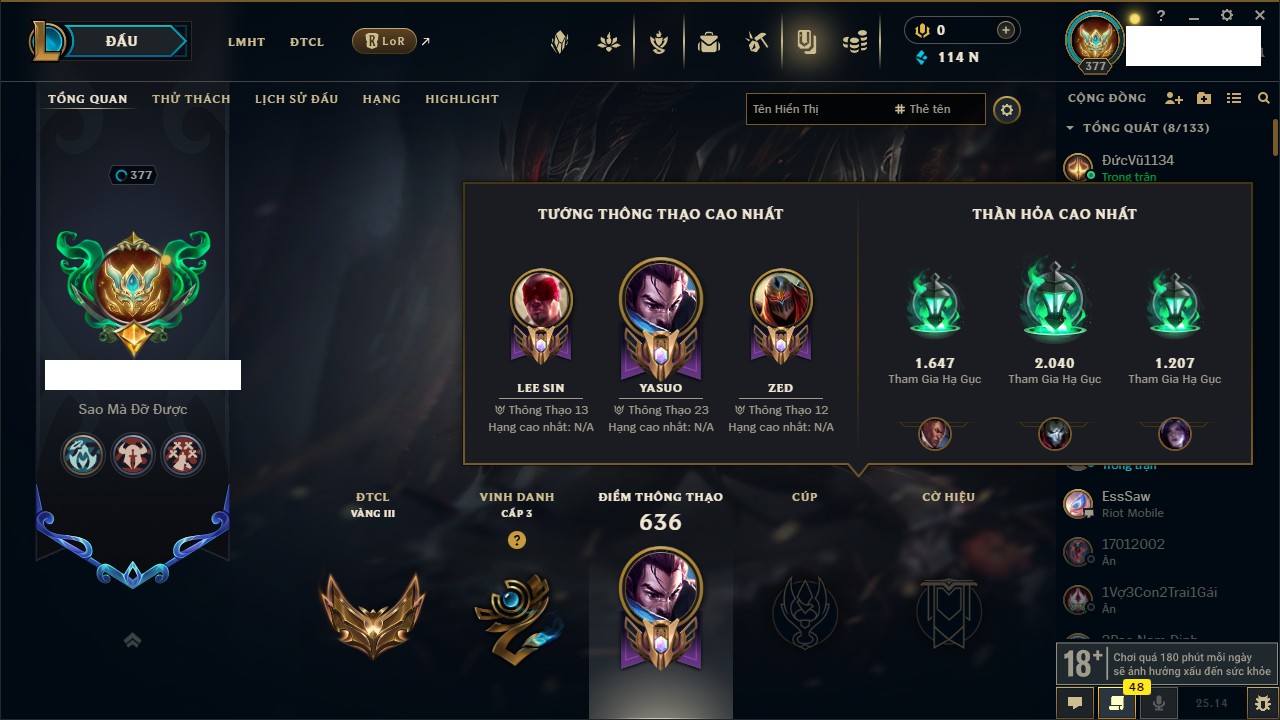Rank Đơn: Đồng IKhung: ĐồngTướng: 168 - Còn 11447 THXTrang Phục: 245Rank ĐTCL: Chưa RankLinh Thú: 53