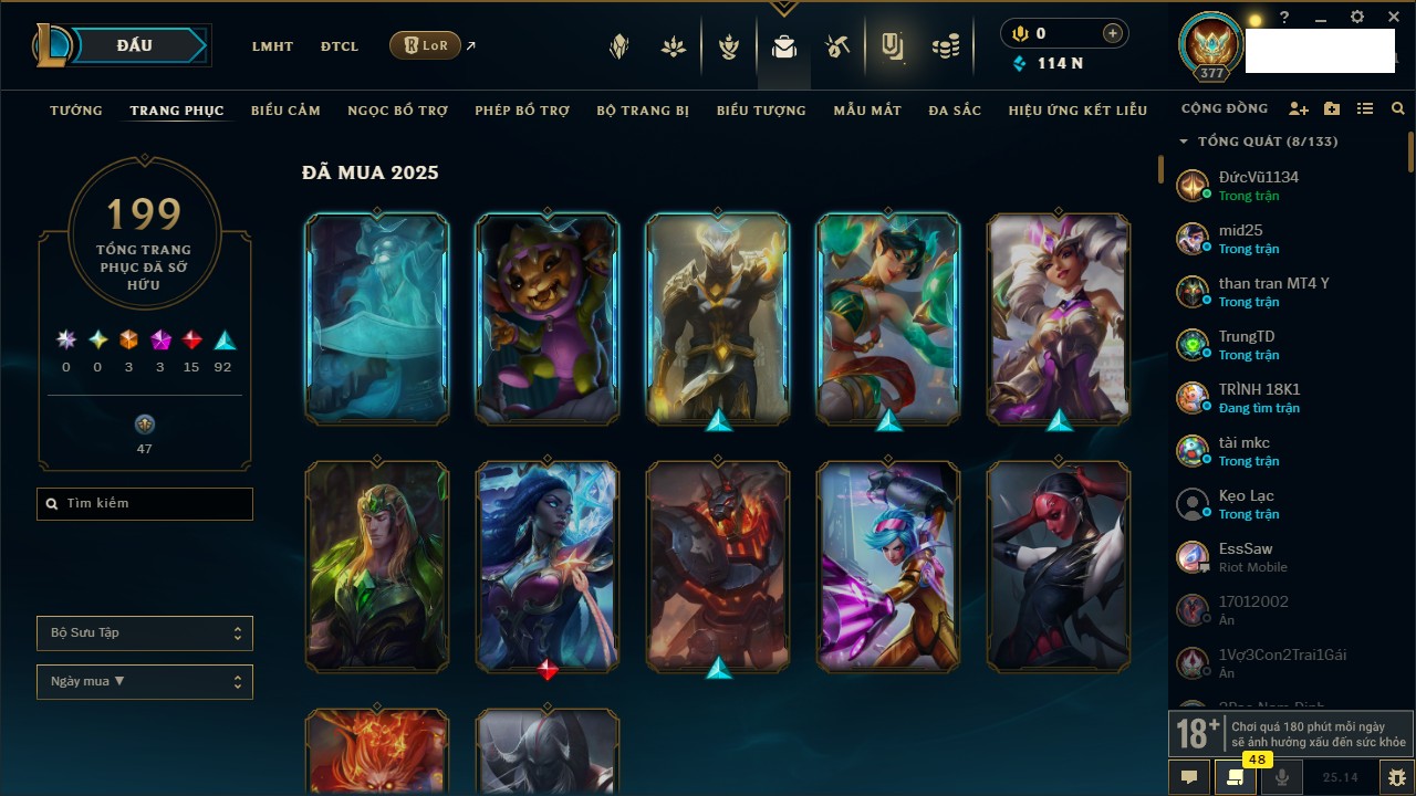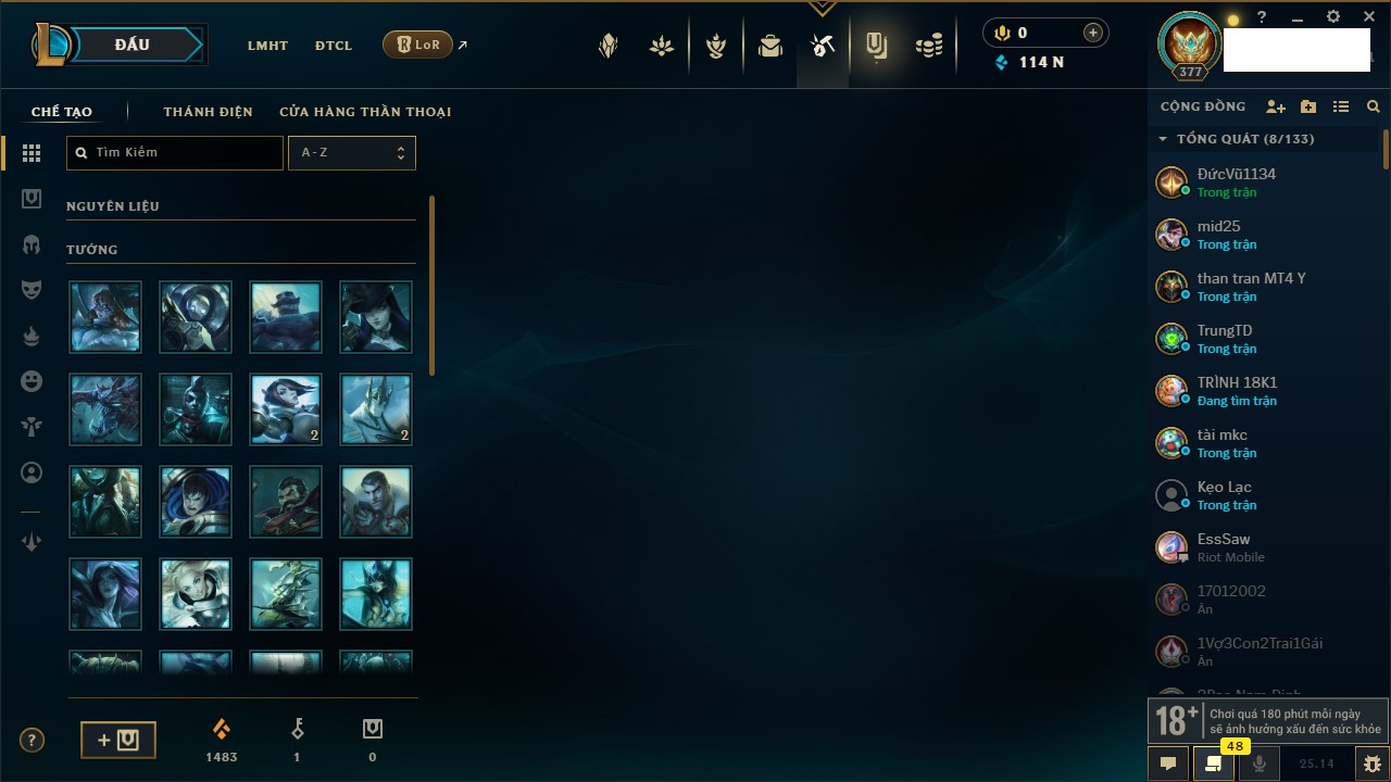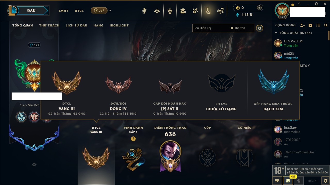 Rank Đơn: Vàng IIIKhung: BạcTướng: 171 - Còn 101359 THXTrang Phục: 88Rank ĐTCL: Kim Cương IVLinh Thú: 200