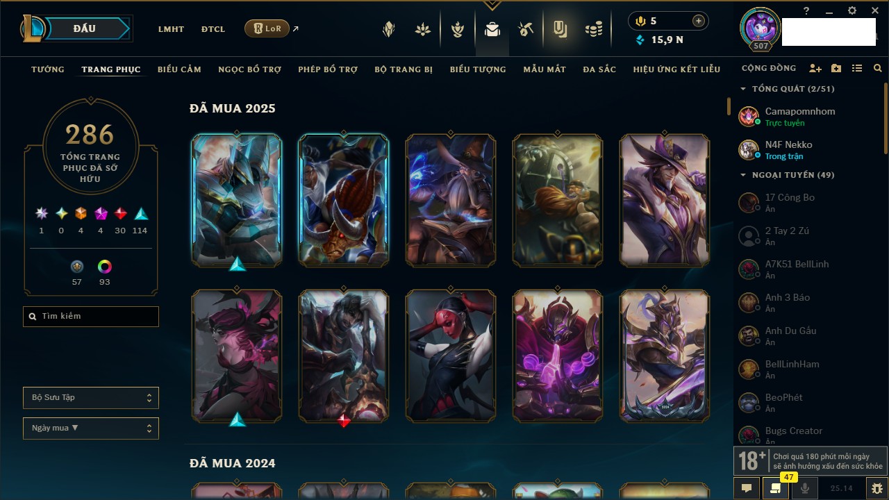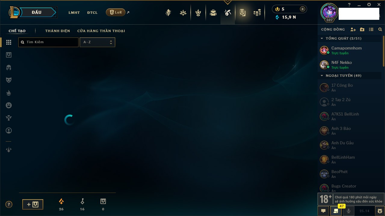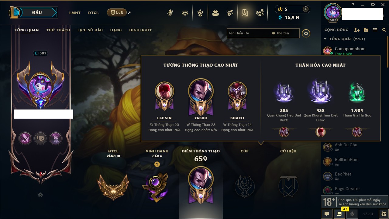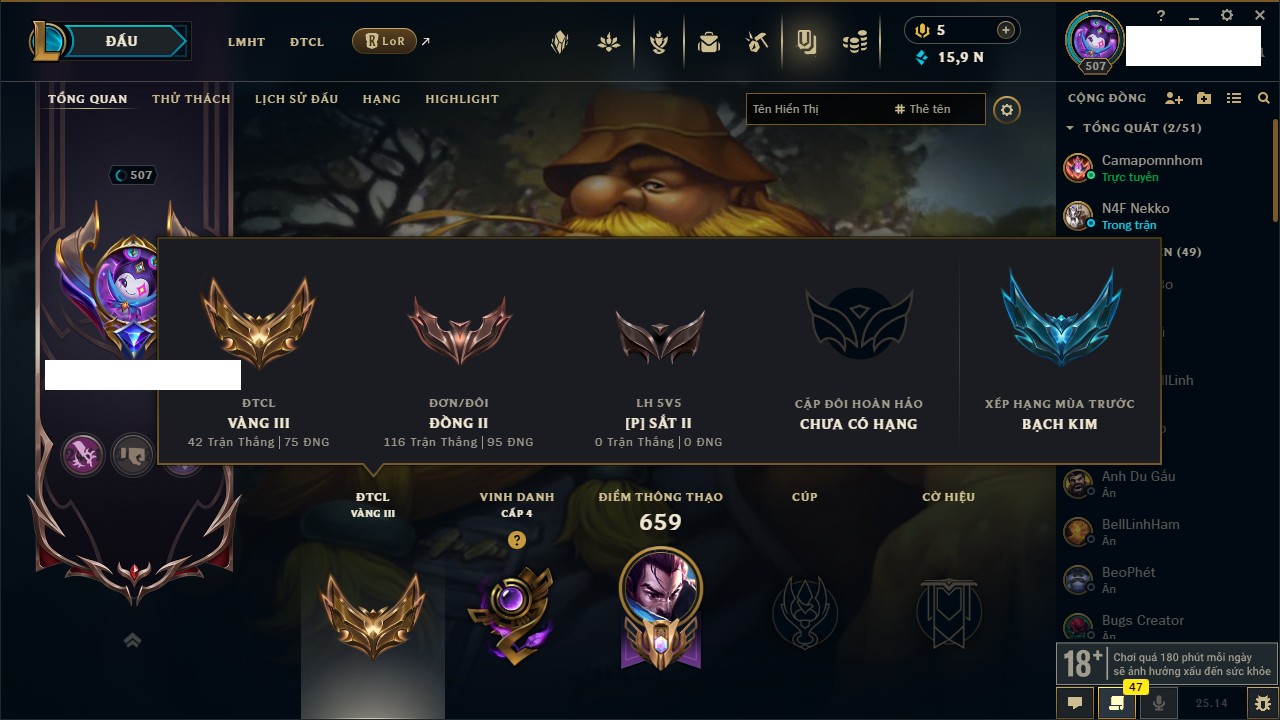 Rank Đơn: Bạc IIKhung: Chưa có khungTướng: 145 - Còn 12230 THXTrang Phục: 183Rank ĐTCL: Chưa RankLinh Thú: 71