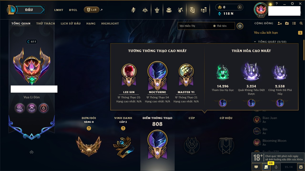 Rank Đơn: Bạc IIKhung: Chưa có khungTướng: 169 - Còn 145151 THXTrang Phục: 237Rank ĐTCL: Chưa RankLinh Thú: 102