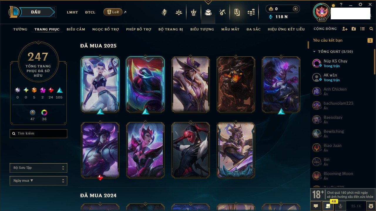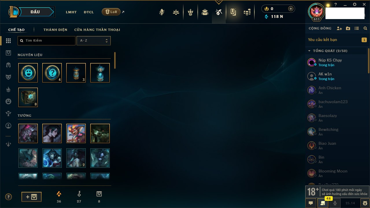 Rank Đơn: Vàng IIKhung: VàngTướng: 171 - Còn 34018 THXTrang Phục: 250Rank ĐTCL: Sắt IILinh Thú: 19