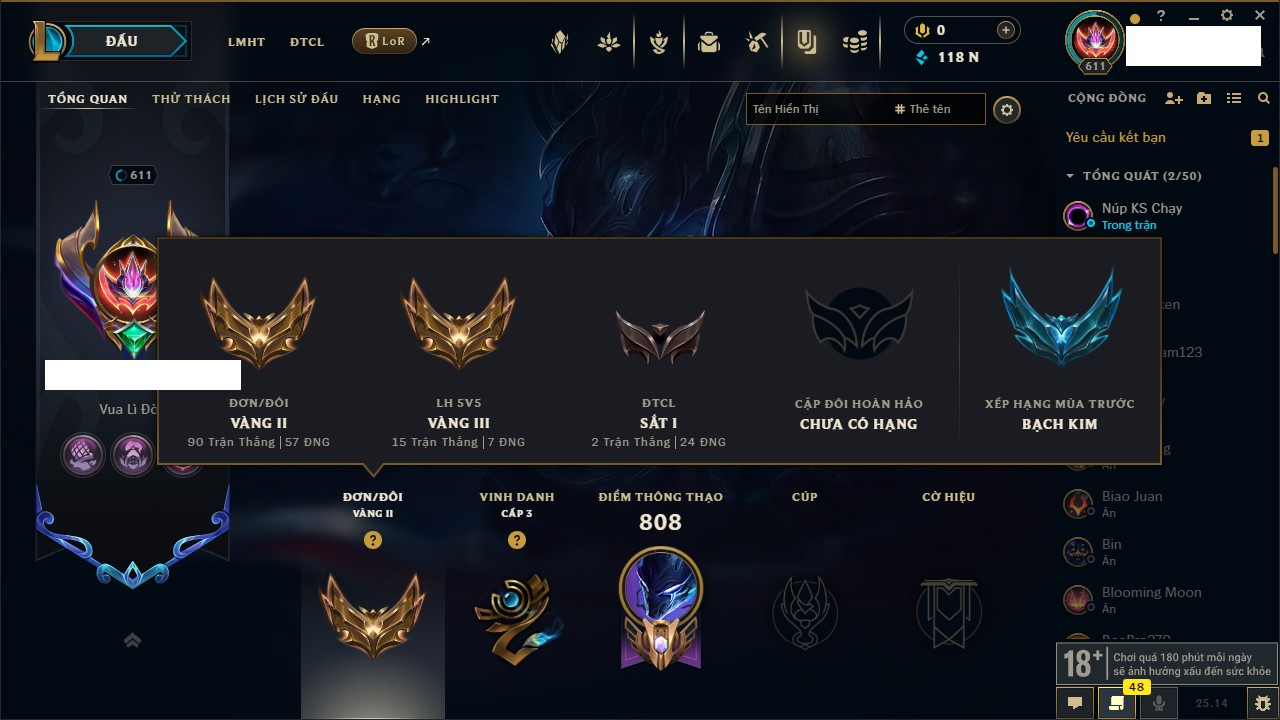 Rank Đơn: Bạch Kim IIIKhung: VàngTướng: 126 - Còn 23055 THXTrang Phục: 114Rank ĐTCL: Chưa RankLinh Thú: 21