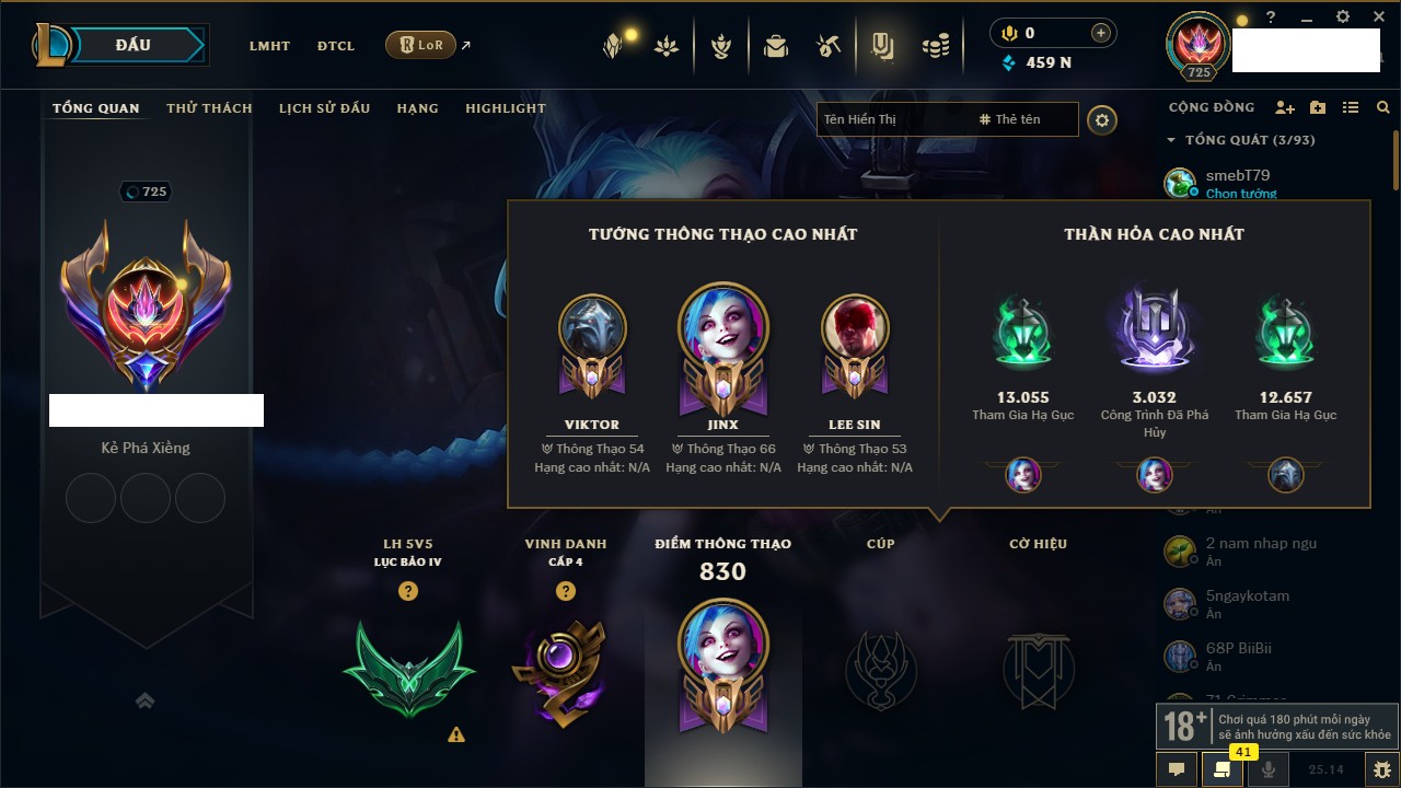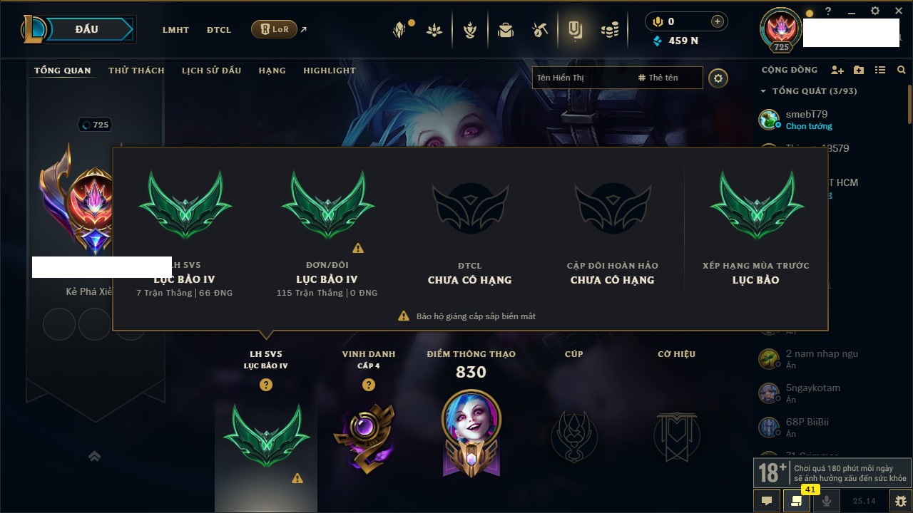 Rank Đơn: Vàng IKhung: BạcTướng: 171 - Còn 60584 THXTrang Phục: 286Rank ĐTCL: Vàng IIILinh Thú: 117