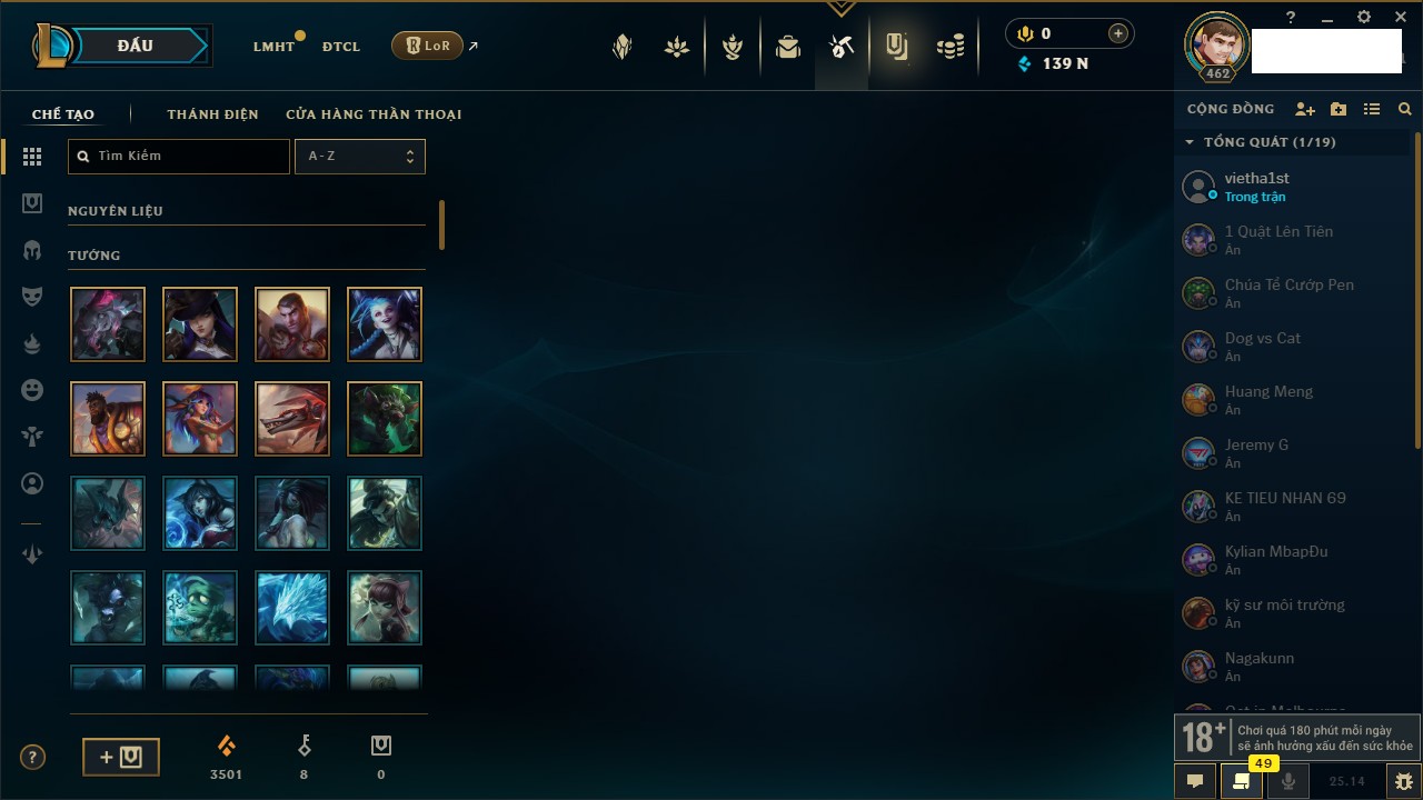 Rank Đơn: Vàng IIKhung: VàngTướng: 171 - Còn 34018 THXTrang Phục: 250Rank ĐTCL: Sắt IILinh Thú: 19