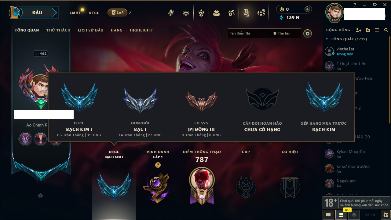 Rank Đơn: Bạc IIIKhung: Chưa có khungTướng: 171 - Còn 21493 THXTrang Phục: 252Rank ĐTCL: Bạch Kim IVLinh Thú: 123