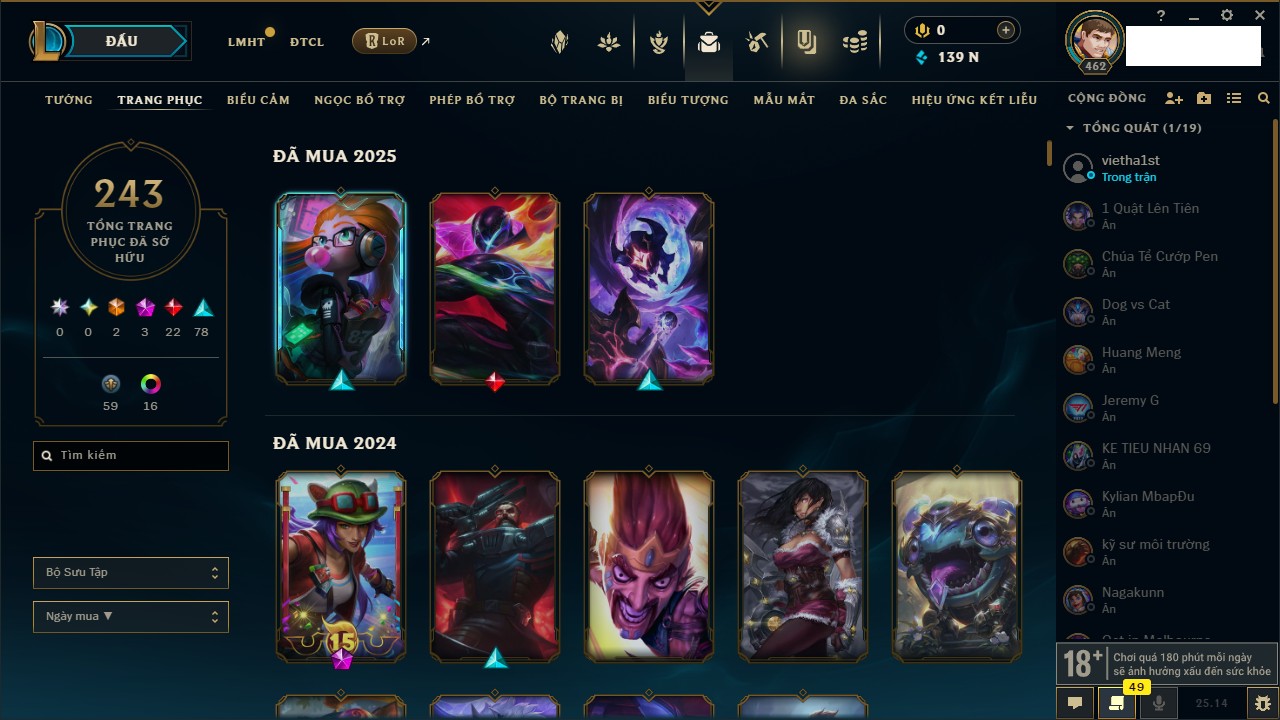 Rank Đơn: Bạc IVKhung: BạcTướng: 171 - Còn 7819 THXTrang Phục: 243Rank ĐTCL: Chưa RankLinh Thú: 102