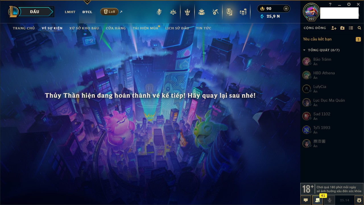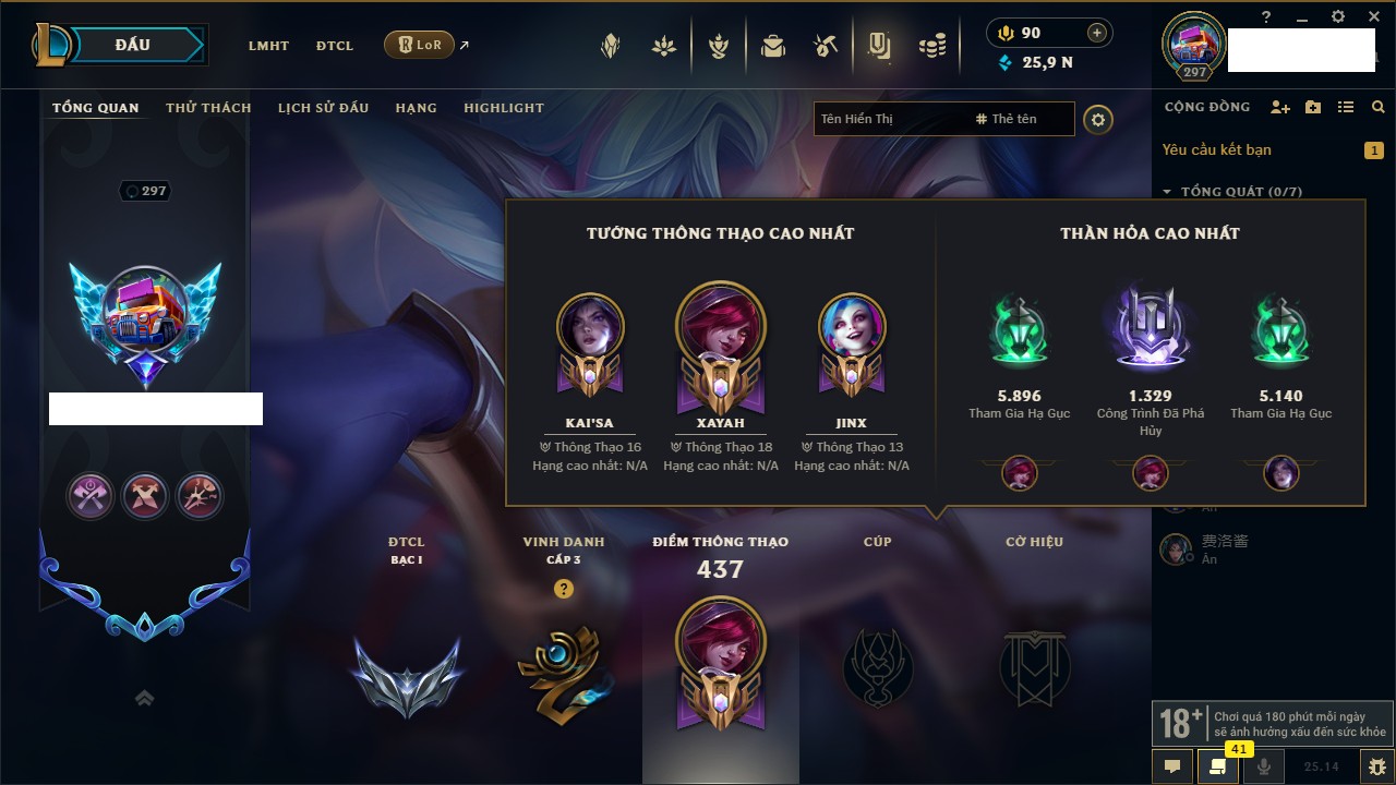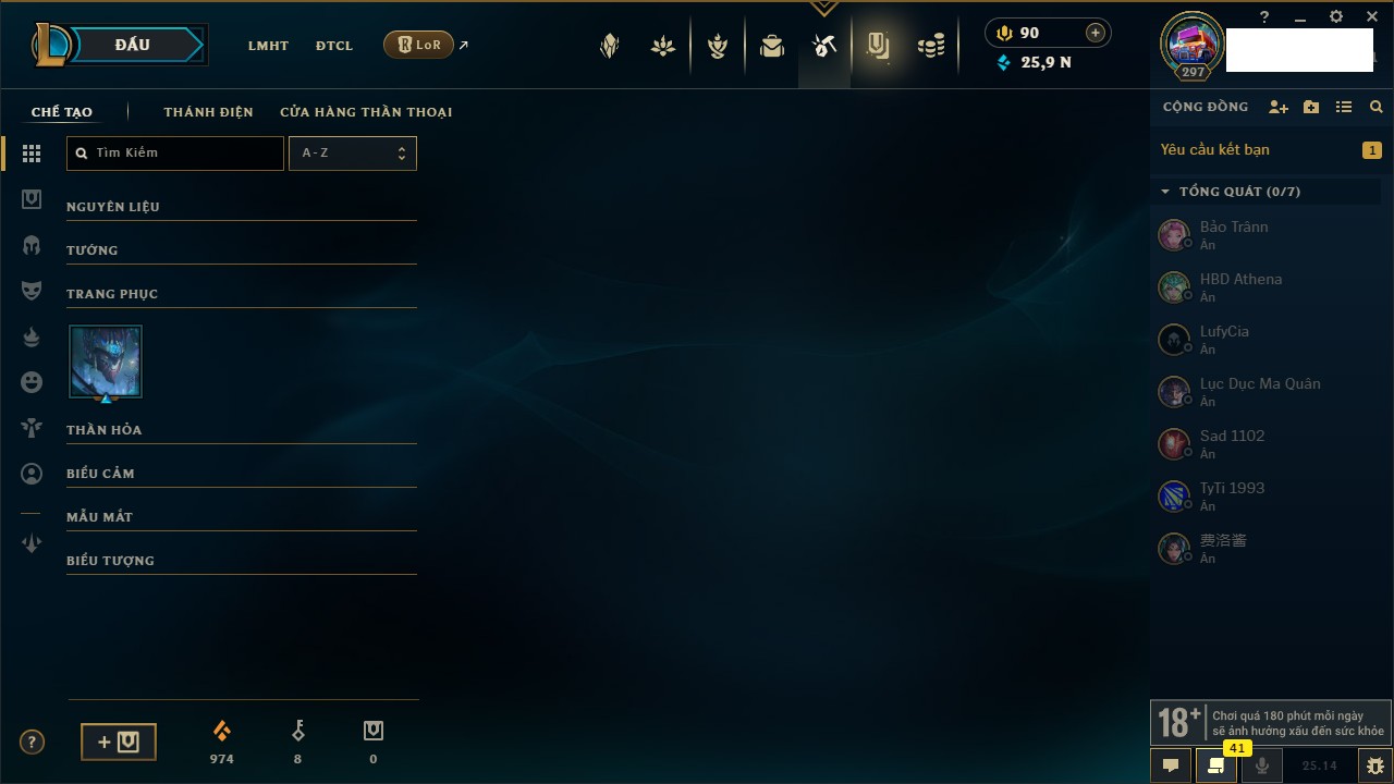 Rank Đơn: Bạc IIIKhung: BạcTướng: 170 - Còn 25973 THXTrang Phục: 274Rank ĐTCL: Chưa RankLinh Thú: 66