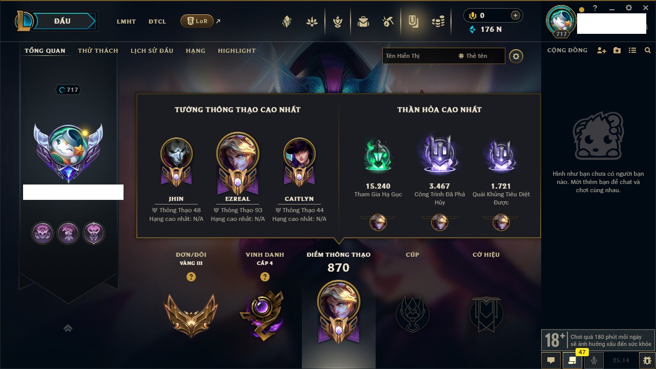Rank Đơn: Bạch Kim IIIKhung: Bạch kimTướng: 170 - Còn 61079 THXTrang Phục: 352Rank ĐTCL: Sắt IILinh Thú: 70
