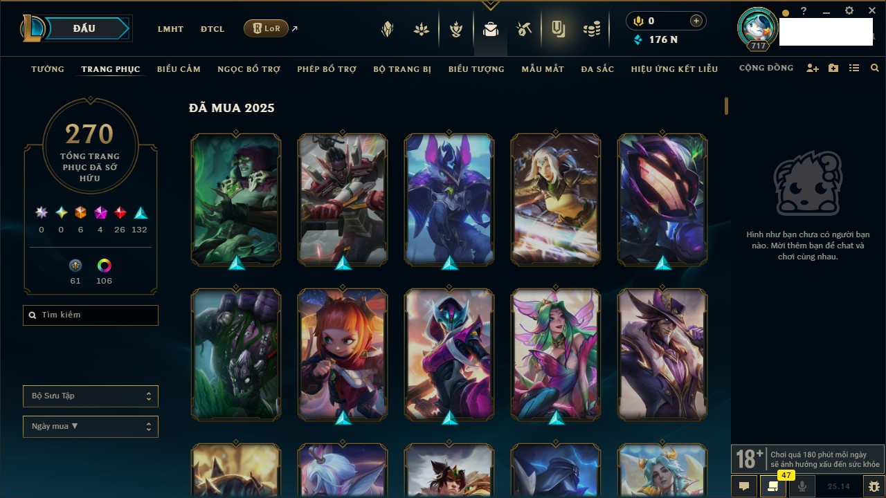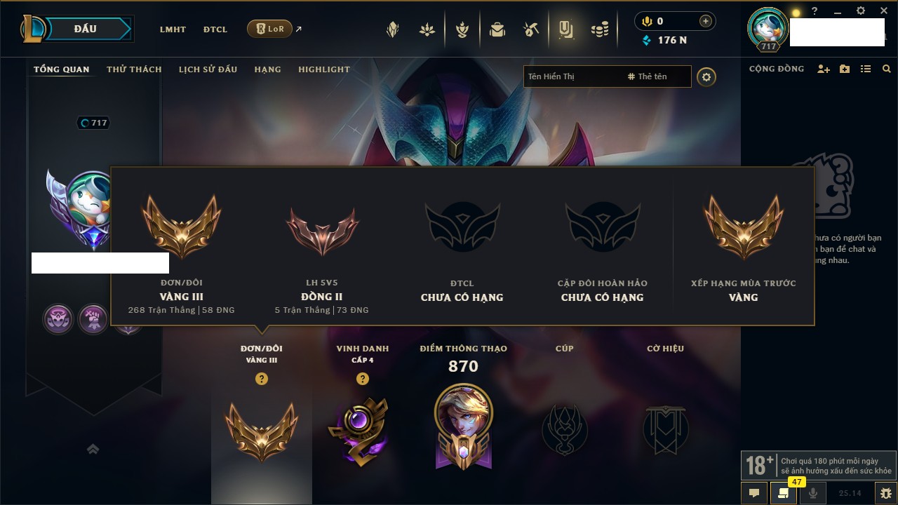 Rank Đơn: Vàng IKhung: Bạch kimTướng: 170 - Còn 212450 THXTrang Phục: 214Rank ĐTCL: Bạch Kim IVLinh Thú: 221