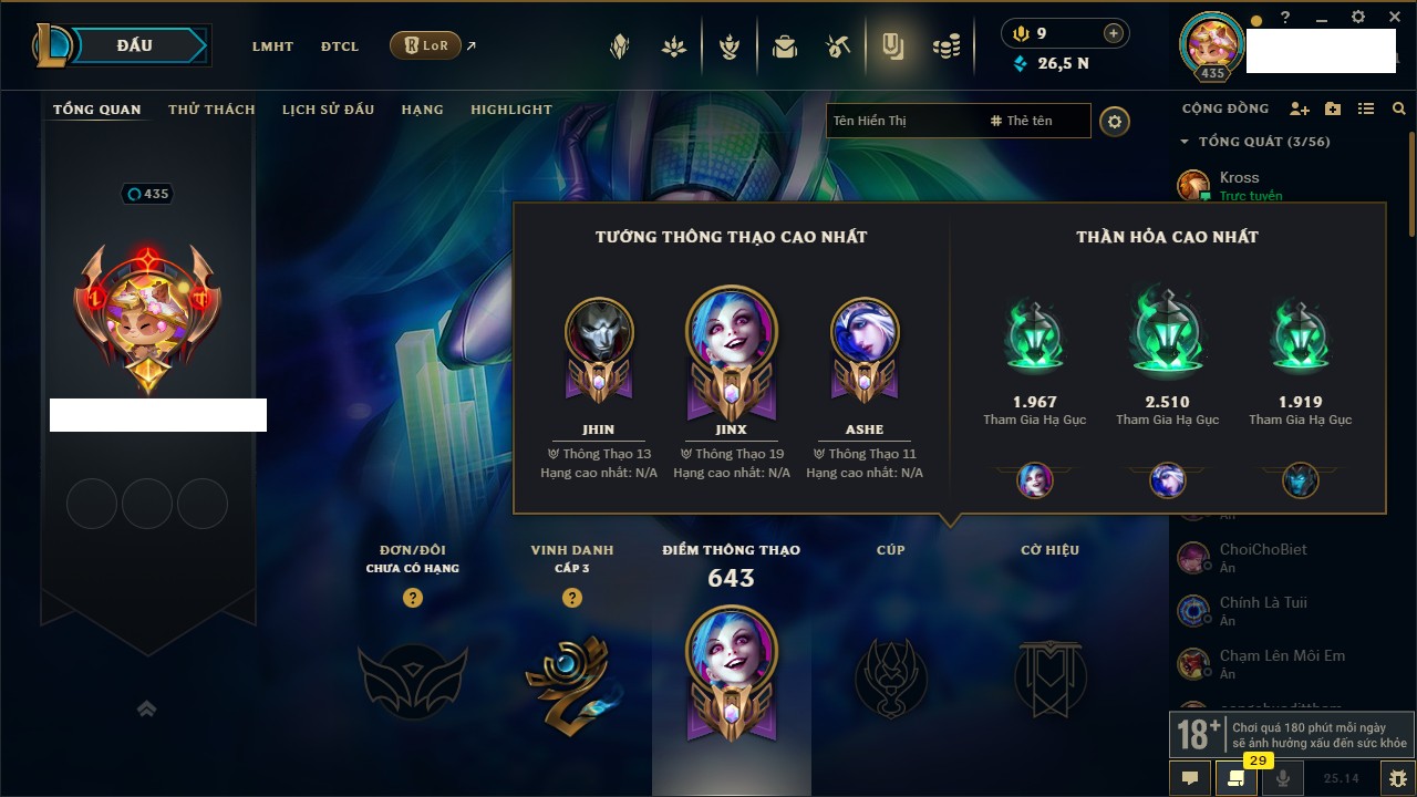 Rank Đơn: Đồng IIIKhung: ĐồngTướng: 170 - Còn 48082 THXTrang Phục: 272Rank ĐTCL: Chưa RankLinh Thú: 84