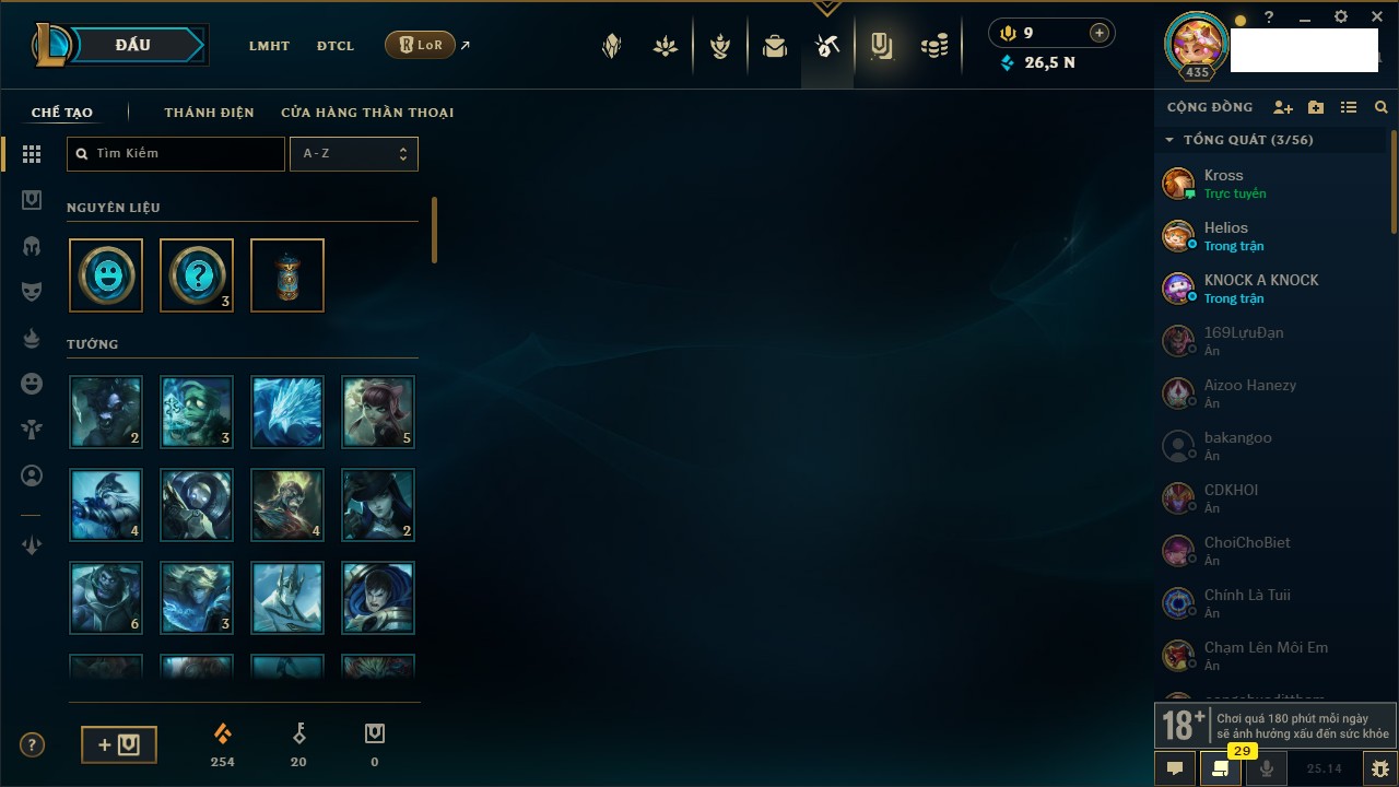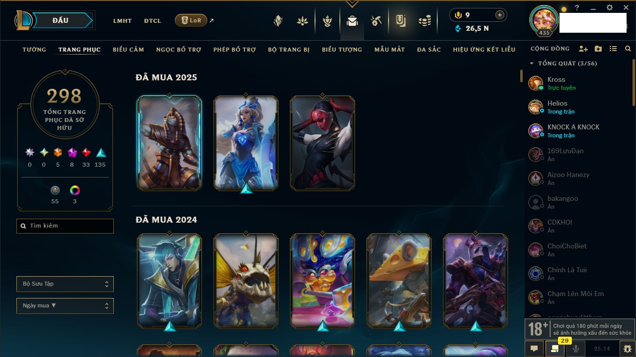 Rank Đơn: Vàng IKhung: Bạch kimTướng: 170 - Còn 212450 THXTrang Phục: 214Rank ĐTCL: Bạch Kim IVLinh Thú: 221