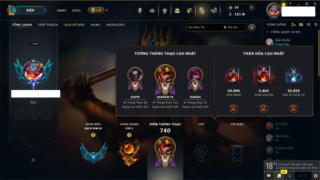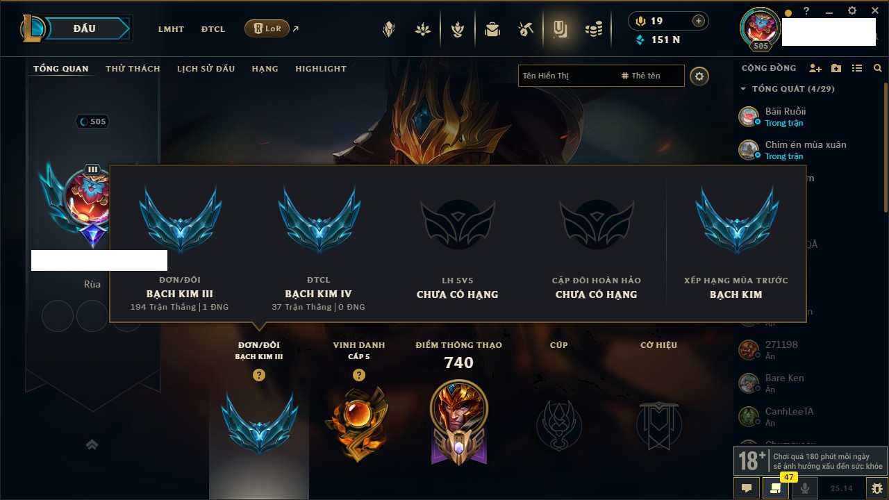 Rank Đơn: Bạch Kim IIKhung: Bạch kimTướng: 171 - Còn 141298 THXTrang Phục: 274Rank ĐTCL: Bạch Kim IILinh Thú: 188