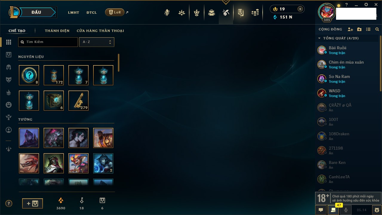 Rank Đơn: Vàng IIIKhung: VàngTướng: 171 - Còn 88128 THXTrang Phục: 329Rank ĐTCL: Chưa RankLinh Thú: 41