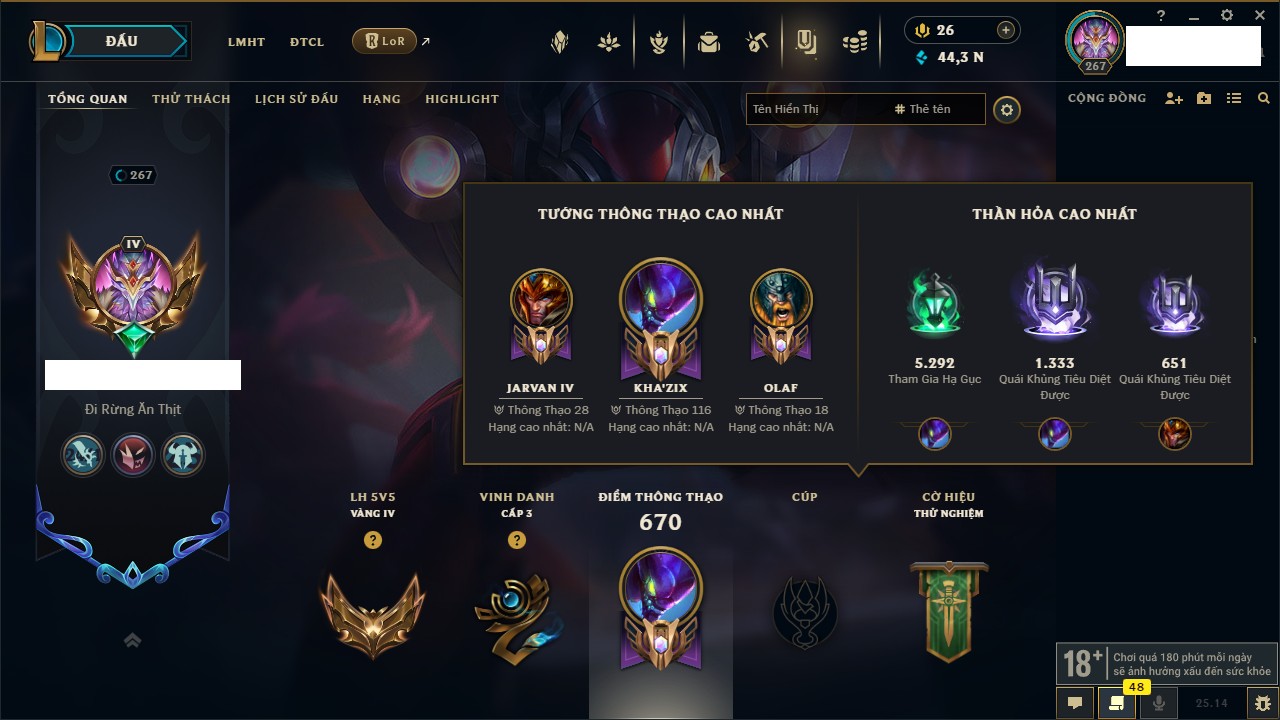 Rank Đơn: Bạc IIIKhung: Chưa có khungTướng: 171 - Còn 21493 THXTrang Phục: 252Rank ĐTCL: Bạch Kim IVLinh Thú: 123