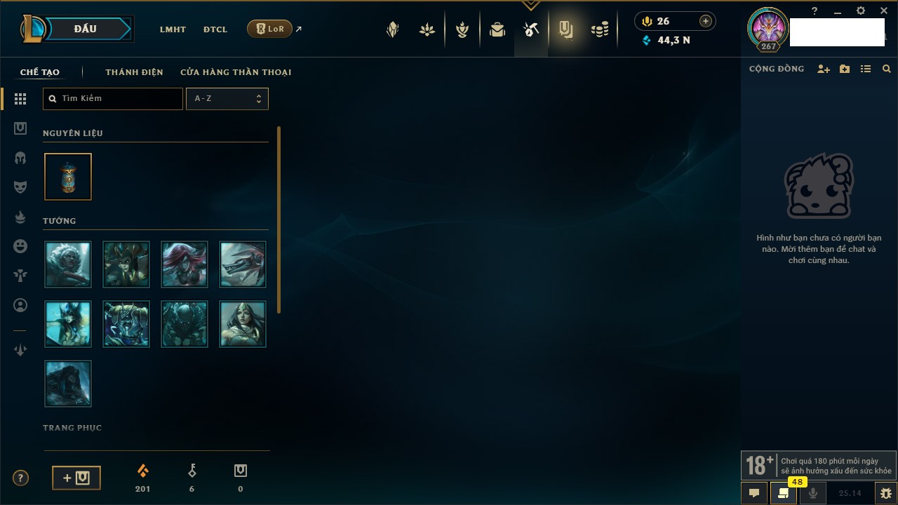 Rank Đơn: Lục Bảo IVKhung: Chưa có khungTướng: 171 - Còn 165973 THXTrang Phục: 160Rank ĐTCL: Chưa RankLinh Thú: 9