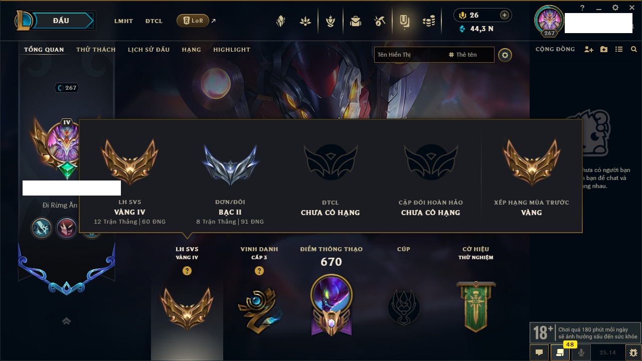 Rank Đơn: Vàng IIKhung: VàngTướng: 171 - Còn 34018 THXTrang Phục: 250Rank ĐTCL: Sắt IILinh Thú: 19
