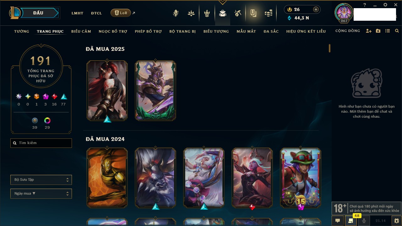 Rank Đơn: Bạc IIKhung: Chưa có khungTướng: 169 - Còn 145151 THXTrang Phục: 237Rank ĐTCL: Chưa RankLinh Thú: 102