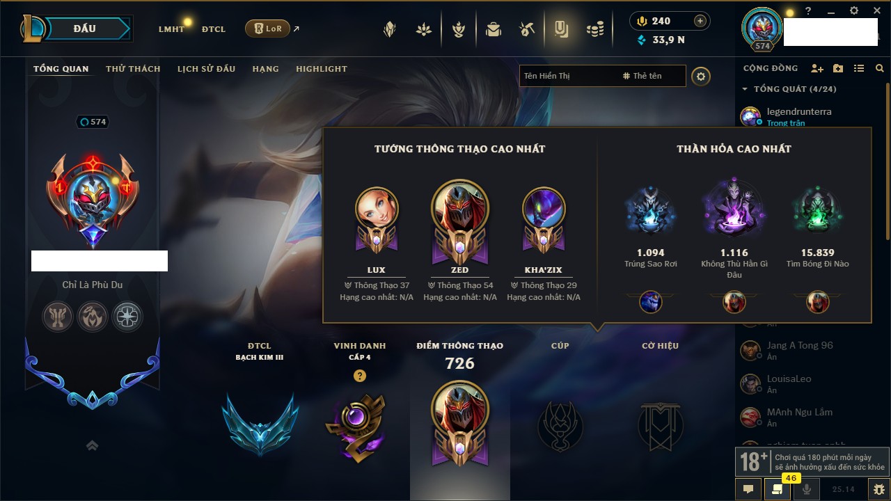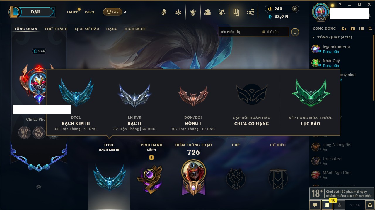 Rank Đơn: Lục Bảo IVKhung: Bạch kimTướng: 171 - Còn 128452 THXTrang Phục: 193Rank ĐTCL: Bạc IIILinh Thú: 100