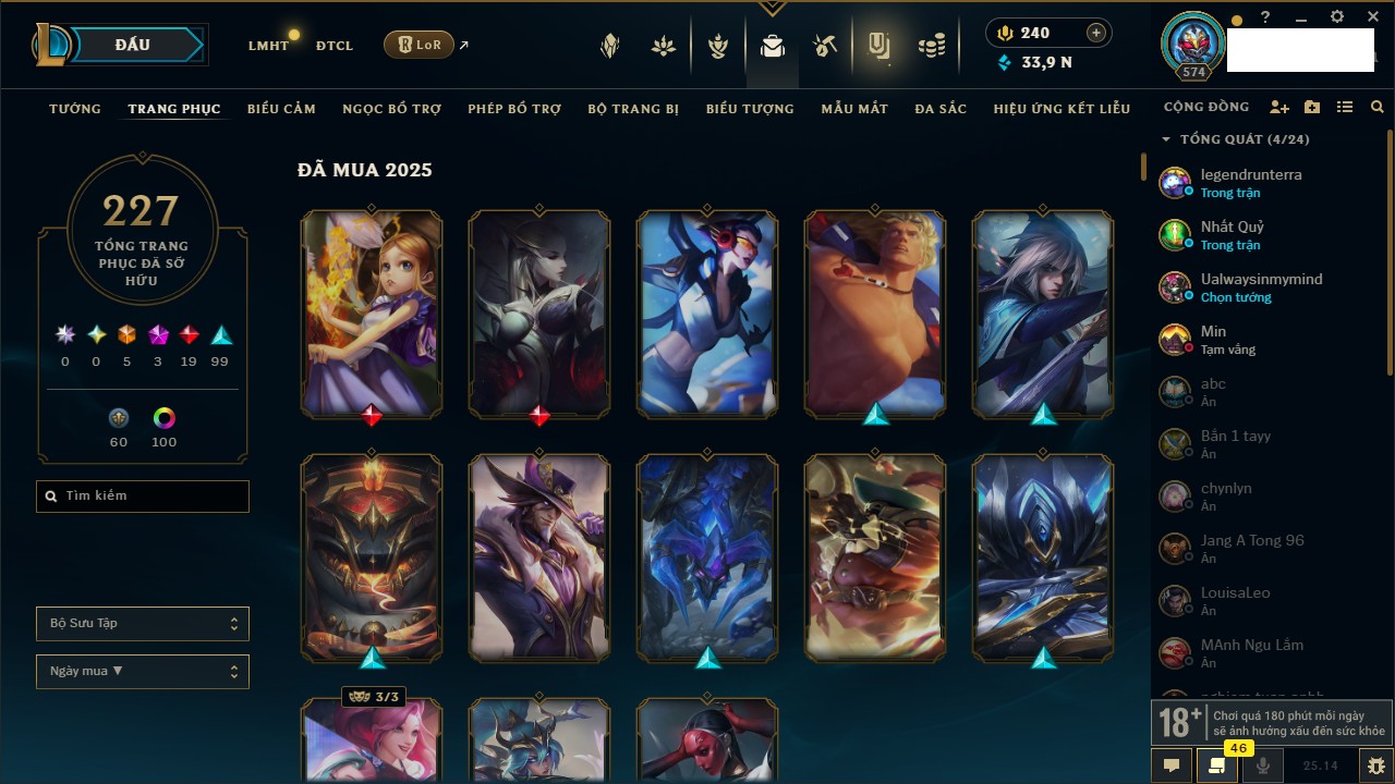 Rank Đơn: Đồng IKhung: ĐồngTướng: 168 - Còn 11447 THXTrang Phục: 245Rank ĐTCL: Chưa RankLinh Thú: 53
