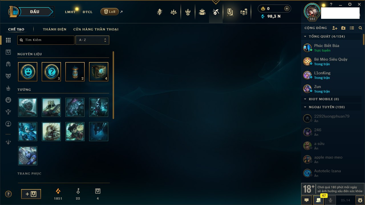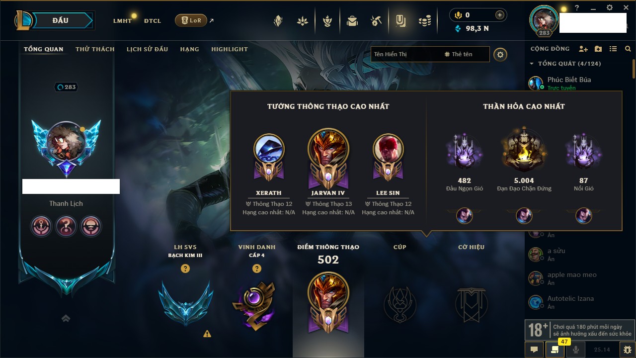 Rank Đơn: Bạc IIIKhung: Chưa có khungTướng: 171 - Còn 21493 THXTrang Phục: 252Rank ĐTCL: Bạch Kim IVLinh Thú: 123