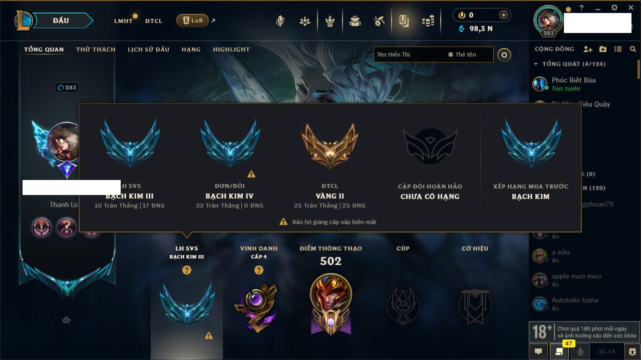 Rank Đơn: Bạch Kim IIIKhung: VàngTướng: 126 - Còn 23055 THXTrang Phục: 114Rank ĐTCL: Chưa RankLinh Thú: 21