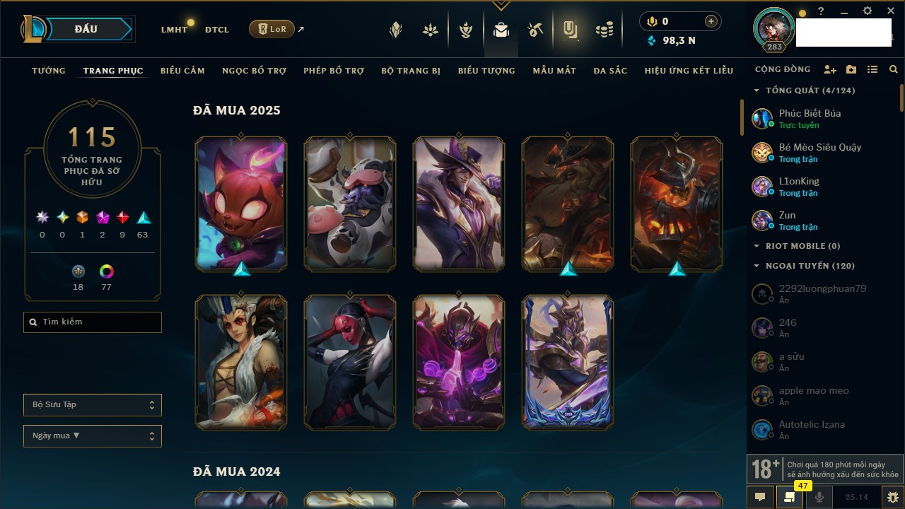 Rank Đơn: Vàng IIIKhung: VàngTướng: 161 - Còn 162202 THXTrang Phục: 179Rank ĐTCL: Chưa RankLinh Thú: 20