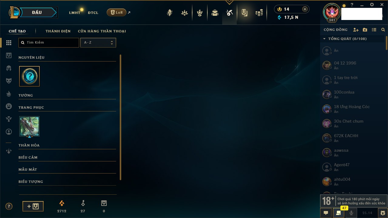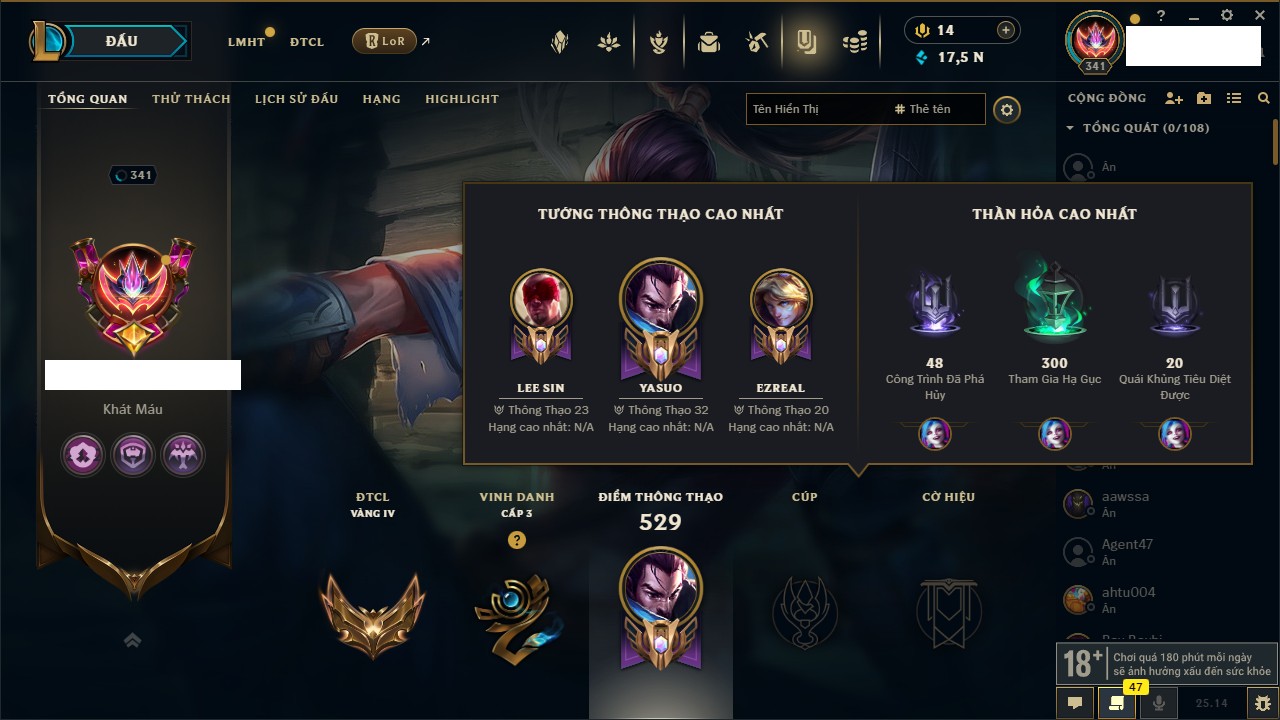 Rank Đơn: Đồng IIKhung: Chưa có khungTướng: 170 - Còn 56487 THXTrang Phục: 90Rank ĐTCL: Chưa RankLinh Thú: 129