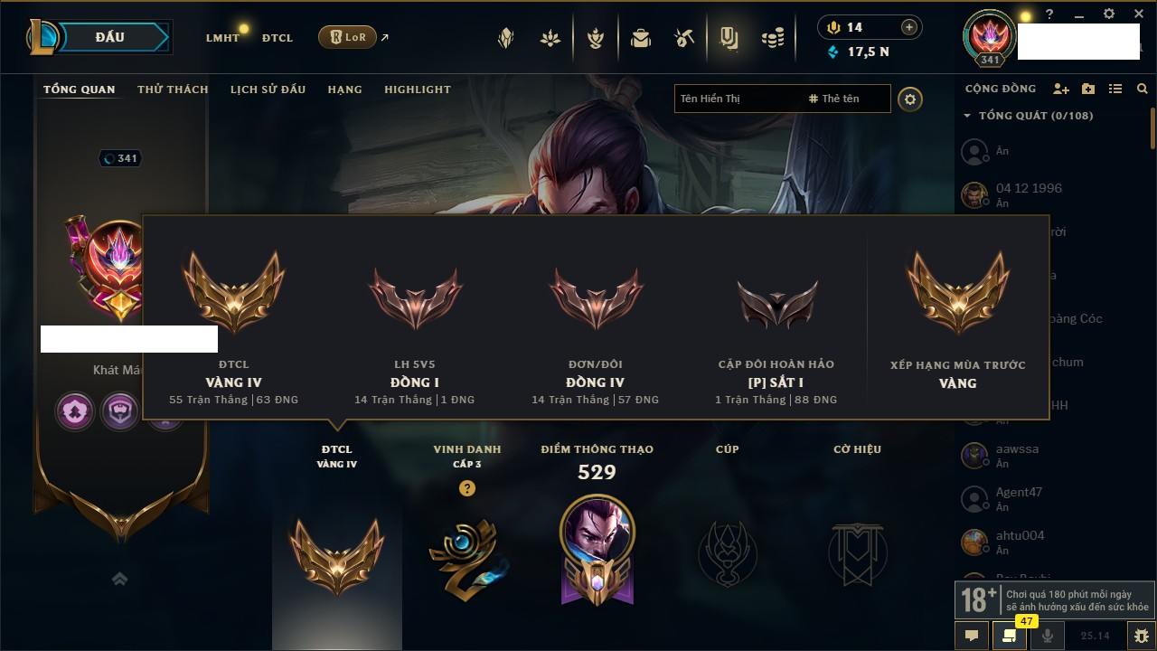 Rank Đơn: Vàng IVKhung: VàngTướng: 146 - Còn 89110 THXTrang Phục: 63Rank ĐTCL: Vàng IIILinh Thú: 41