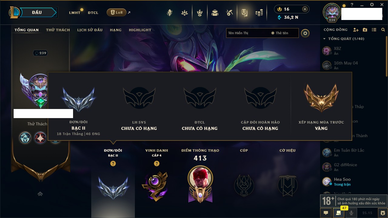 Rank Đơn: Vàng IIIKhung: BạcTướng: 171 - Còn 101359 THXTrang Phục: 88Rank ĐTCL: Kim Cương IVLinh Thú: 200
