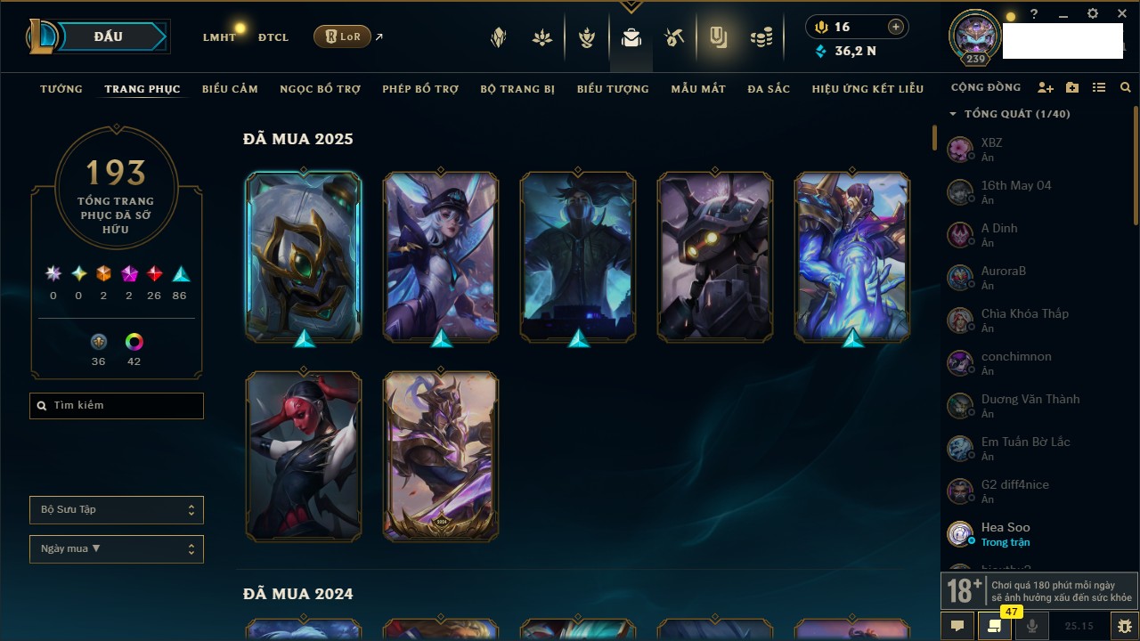 Rank Đơn: Vàng IVKhung: VàngTướng: 171 - Còn 56632 THXTrang Phục: 215Rank ĐTCL: Bạc ILinh Thú: 71