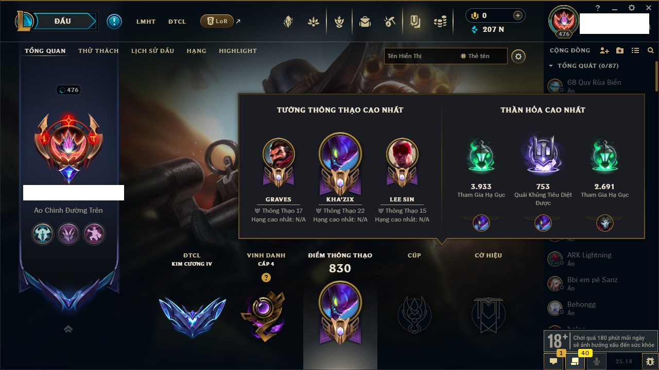 Rank Đơn: Đồng IVKhung: Chưa có khungTướng: 162 - Còn 32315 THXTrang Phục: 275Rank ĐTCL: Chưa RankLinh Thú: 33