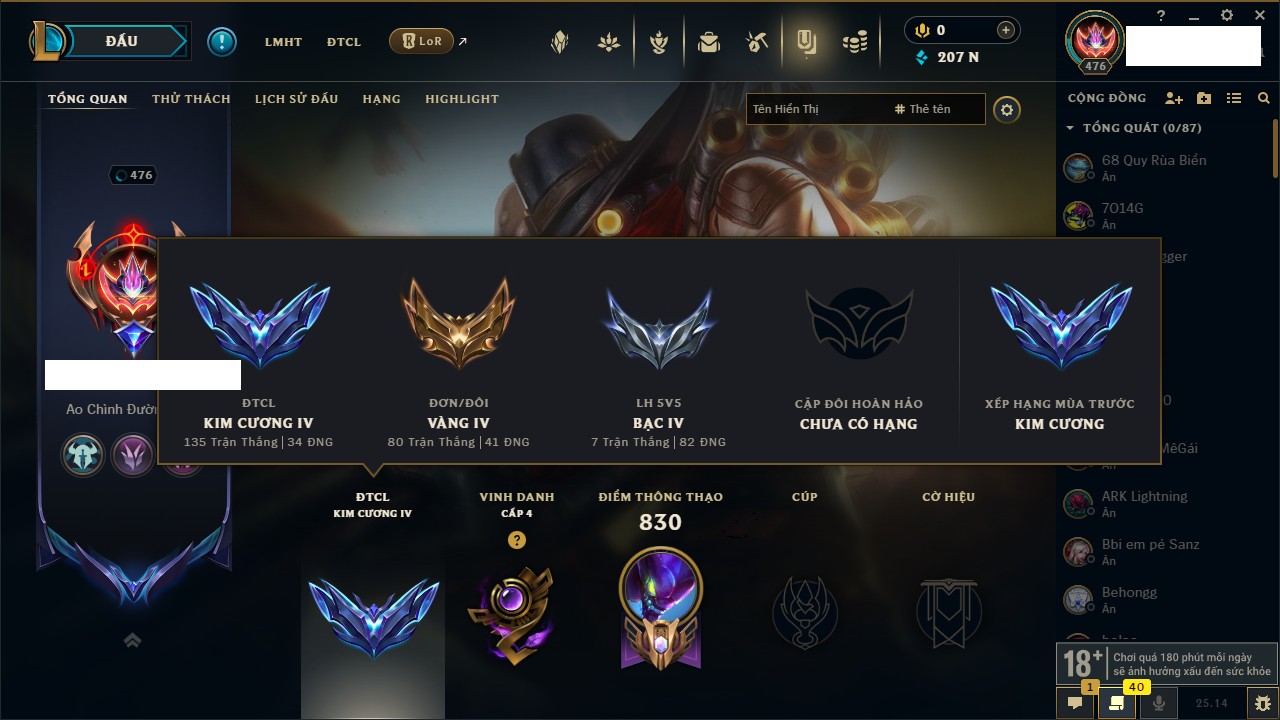 Rank Đơn: Vàng IVKhung: VàngTướng: 171 - Còn 135001 THXTrang Phục: 195Rank ĐTCL: Bạch Kim IVLinh Thú: 147