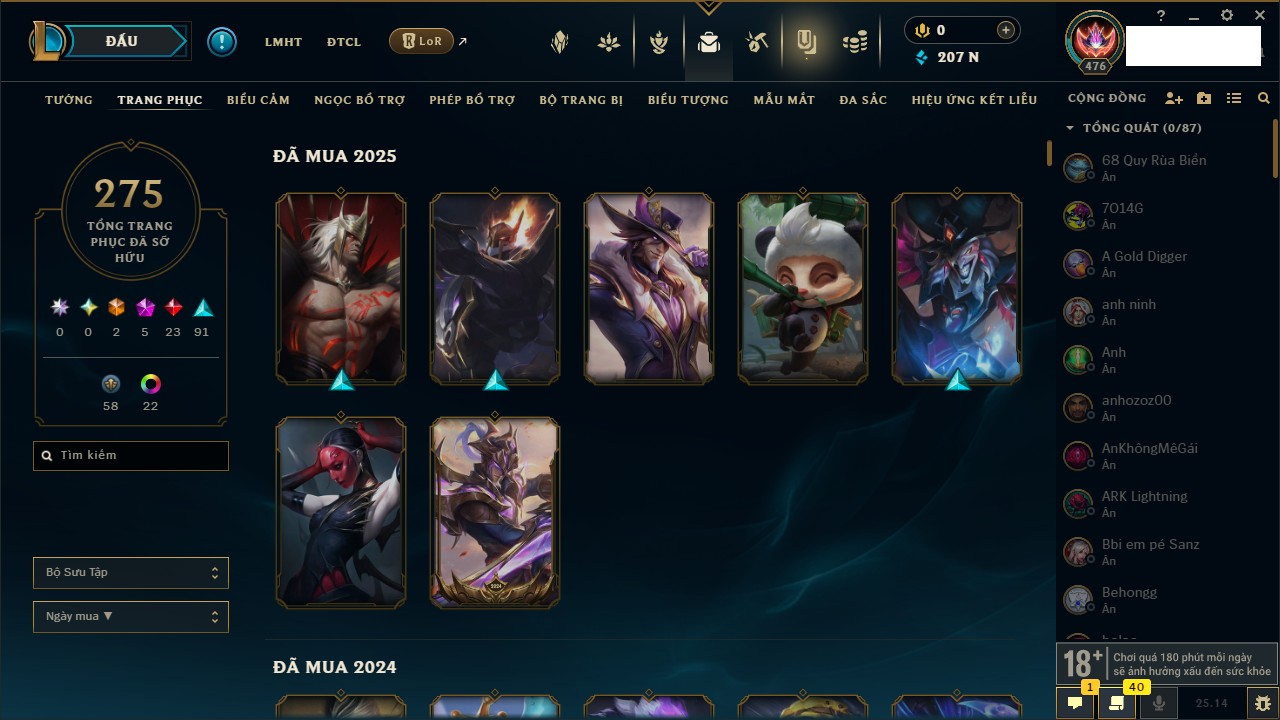 Rank Đơn: Vàng IVKhung: VàngTướng: 170 - Còn 207451 THXTrang Phục: 275Rank ĐTCL: Chưa RankLinh Thú: 186
