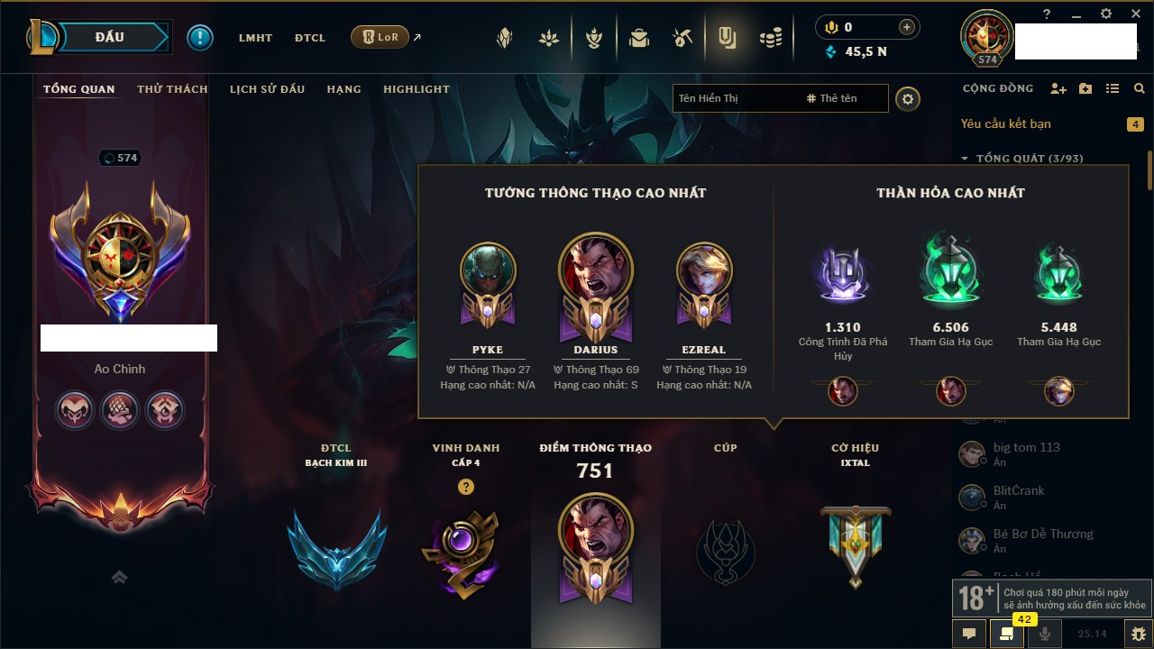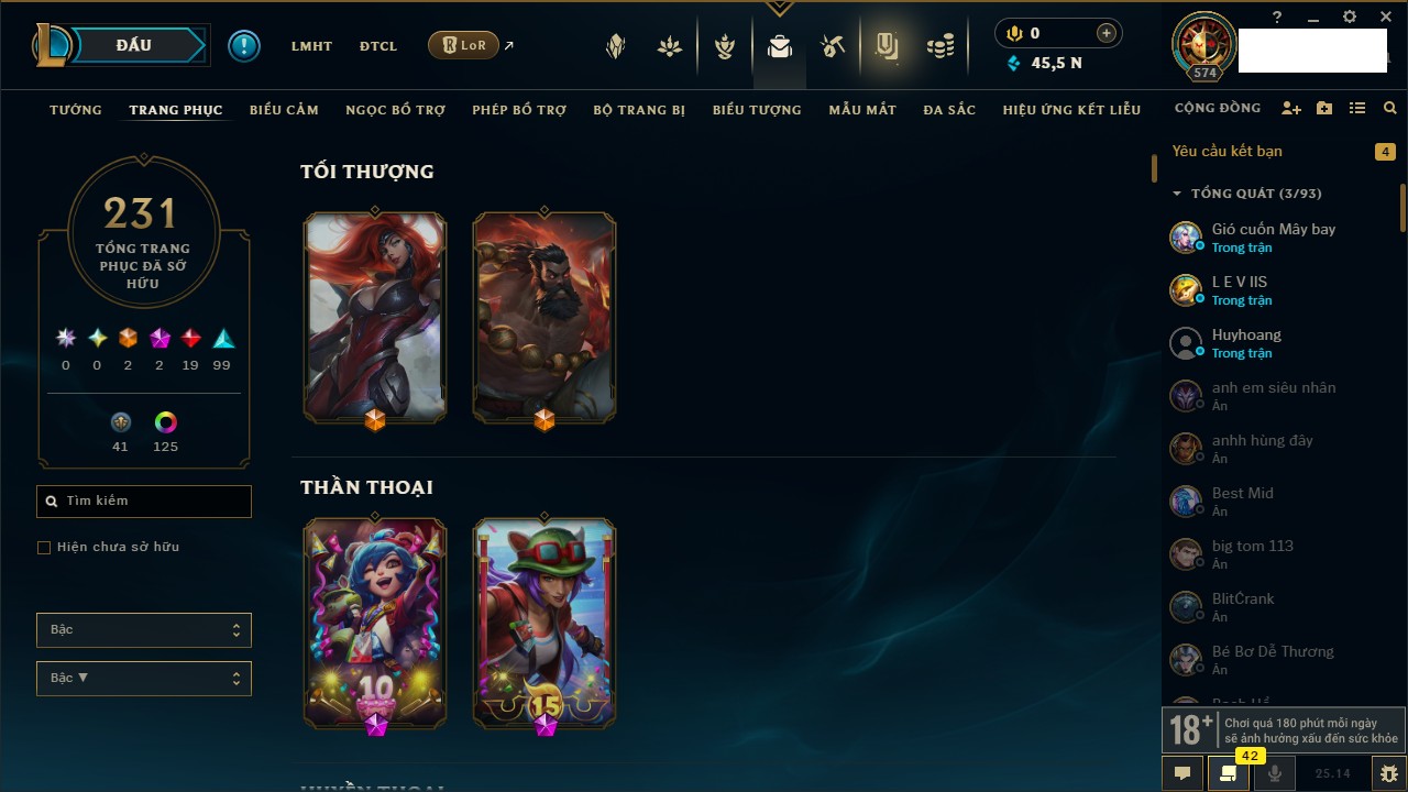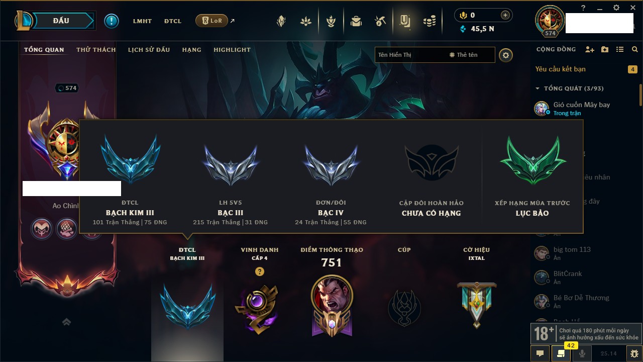 Rank Đơn: Lục Bảo IVKhung: Bạch kimTướng: 171 - Còn 128452 THXTrang Phục: 193Rank ĐTCL: Bạc IIILinh Thú: 100