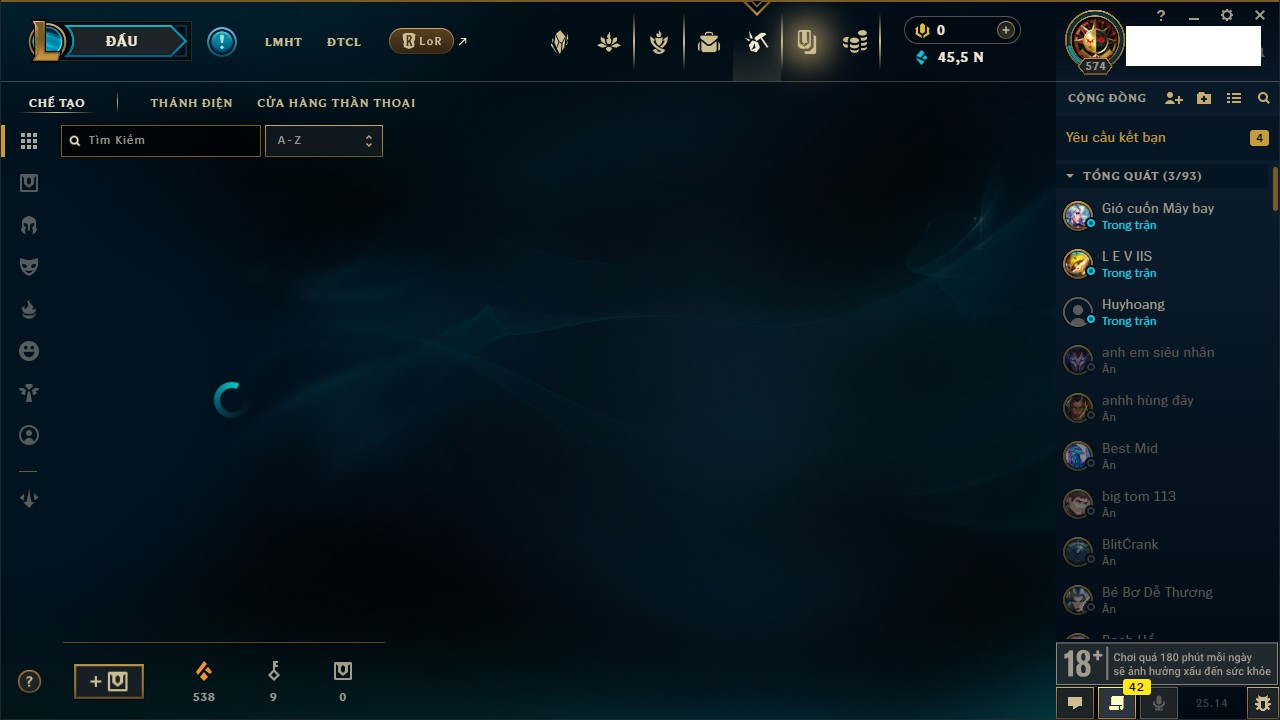 Rank Đơn: Vàng IIIKhung: BạcTướng: 171 - Còn 101359 THXTrang Phục: 88Rank ĐTCL: Kim Cương IVLinh Thú: 200