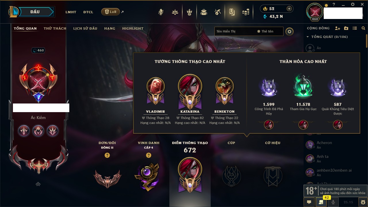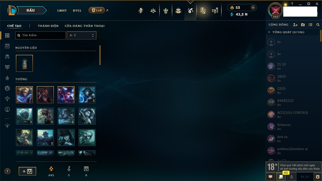 Rank Đơn: Sắt IVKhung: SắtTướng: 171 - Còn 231744 THXTrang Phục: 376Rank ĐTCL: Bạch Kim IILinh Thú: 120